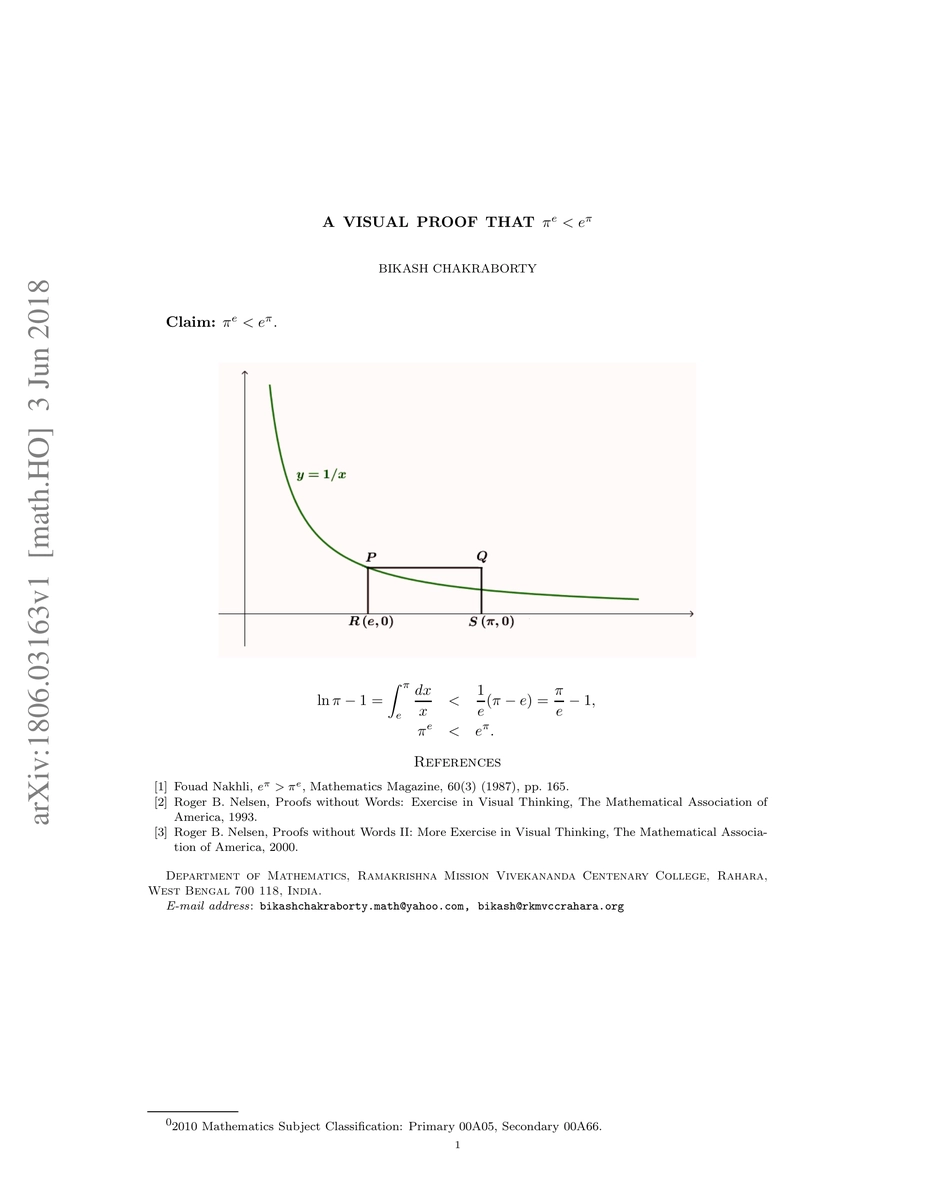 In this article, we give another visual proof of $\pi^e < e^\pi$.