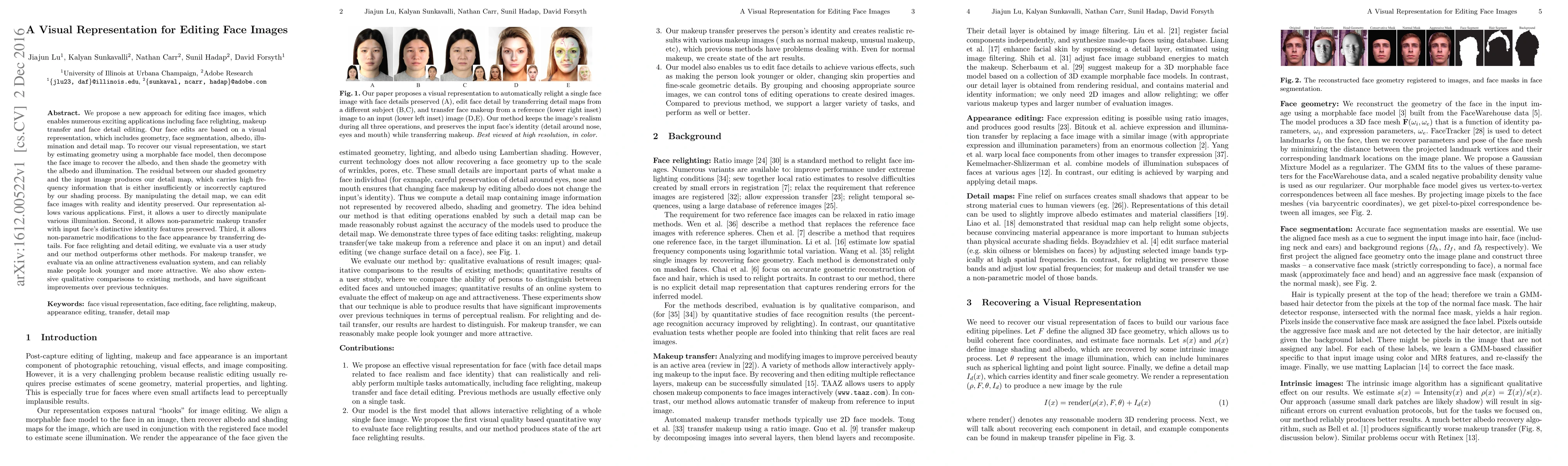 This paper introduces a visual representation for editing face images, enabling applications like relighting, makeup transfer, and detail editing. The method decomposes faces into geometry, segmentation, albedo, illumination, and a detail map, allowing for realistic manipulations while preserving identity.