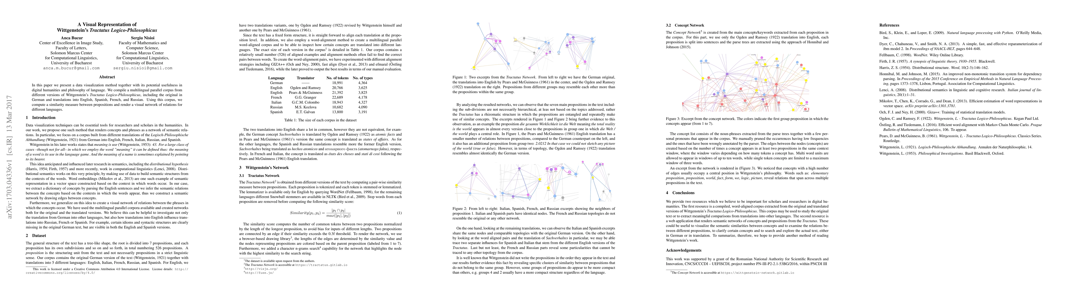 In this paper we present a data visualization method together with its potential usefulness in digital humanities and philosophy of language. We compile a multilingual parallel corpus from different versions of Wittgenstein's Tractatus Logico-Philosophicus, including the original in German and translations into English, Spanish, French, and Russian. Using this corpus, we compute a similarity measure between propositions and render a visual network of relations for different languages.