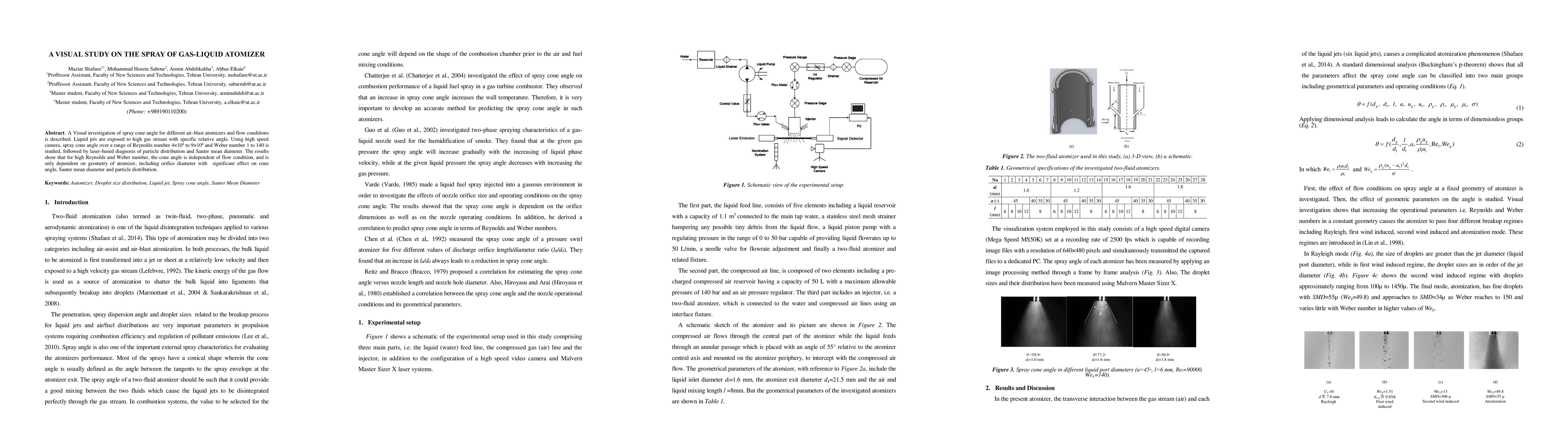 A Visual investigation of spray cone angle for different air-blast atomizers and flow conditions is described. Liquid jets are exposed to high gas stream with specific relative angle. Using high speed camera, spray cone angle over a range of Reynolds number 4x104 to 9x104 and Weber number 1 to 140 is studied, followed by laser-based diagnosis of particle distribution and Sauter mean diameter. The results show that for high Reynolds and Weber number, the cone angle is independent of flow condition, and is only dependent on geometry of atomizer, including orifice diameter with significant effect on cone angle, Sauter mean diameter and particle distribution