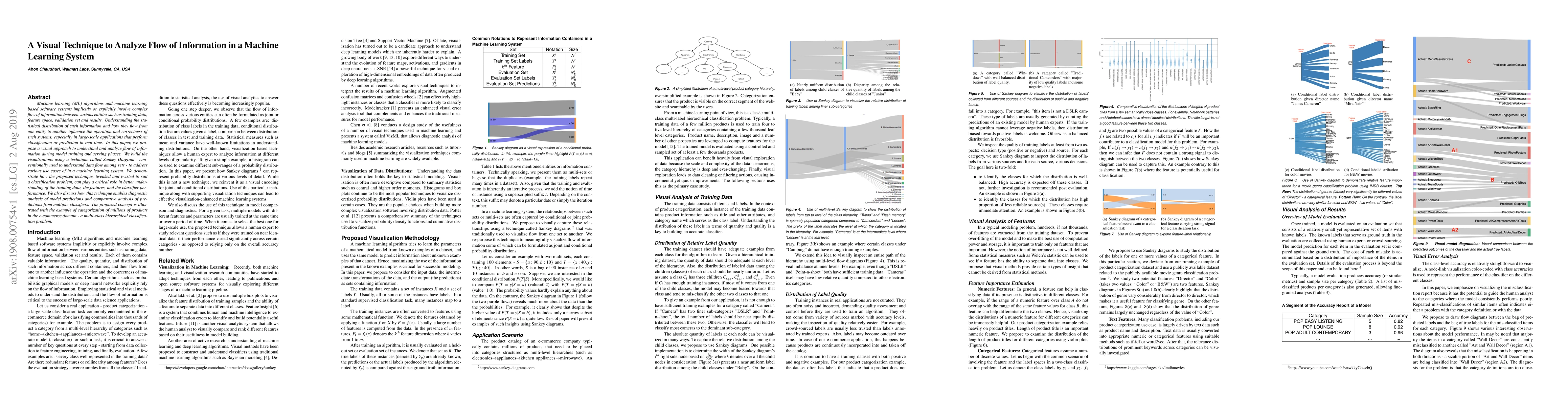 Machine learning (ML) algorithms and machine learning based software systems implicitly or explicitly involve complex flow of information between various entities such as training data, feature space, validation set and results. Understanding the statistical distribution of such information and how they flow from one entity to another influence the operation and correctness of such systems, especially in large-scale applications that perform classification or prediction in real time. In this paper, we propose a visual approach to understand and analyze flow of information during model training and serving phases. We build the visualizations using a technique called Sankey Diagram - conventionally used to understand data flow among sets - to address various use cases of in a machine learning system. We demonstrate how the proposed technique, tweaked and twisted to suit a classification problem, can play a critical role in better understanding of the training data, the features, and the classifier performance. We also discuss how this technique enables diagnostic analysis of model predictions and comparative analysis of predictions from multiple classifiers. The proposed concept is illustrated with the example of categorization of millions of products in the e-commerce domain - a multi-class hierarchical classification problem.