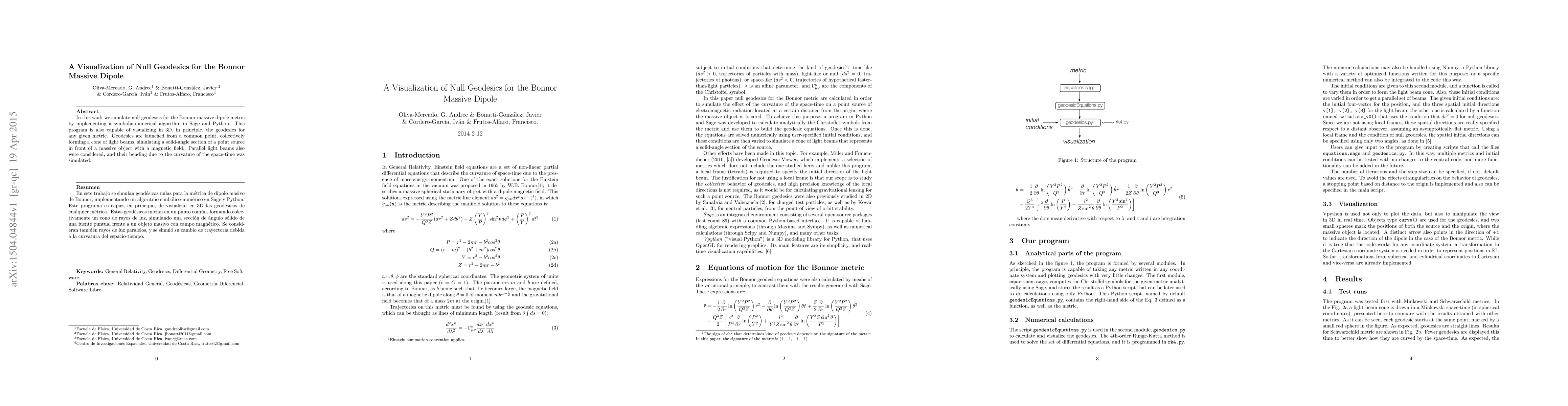 In this work we simulate null geodesics for the Bonnor massive dipole metric by implementing a symbolic-numerical algorithm in Sage and Python. This program is also capable of visualizing in 3D, in principle, the geodesics for any given metric. Geodesics are launched from a common point, collectively forming a cone of light beams, simulating a solid-angle section of a point source in front of a massive object with a magnetic field. Parallel light beams also were considered, and their bending due to the curvature of the space-time was simulated.