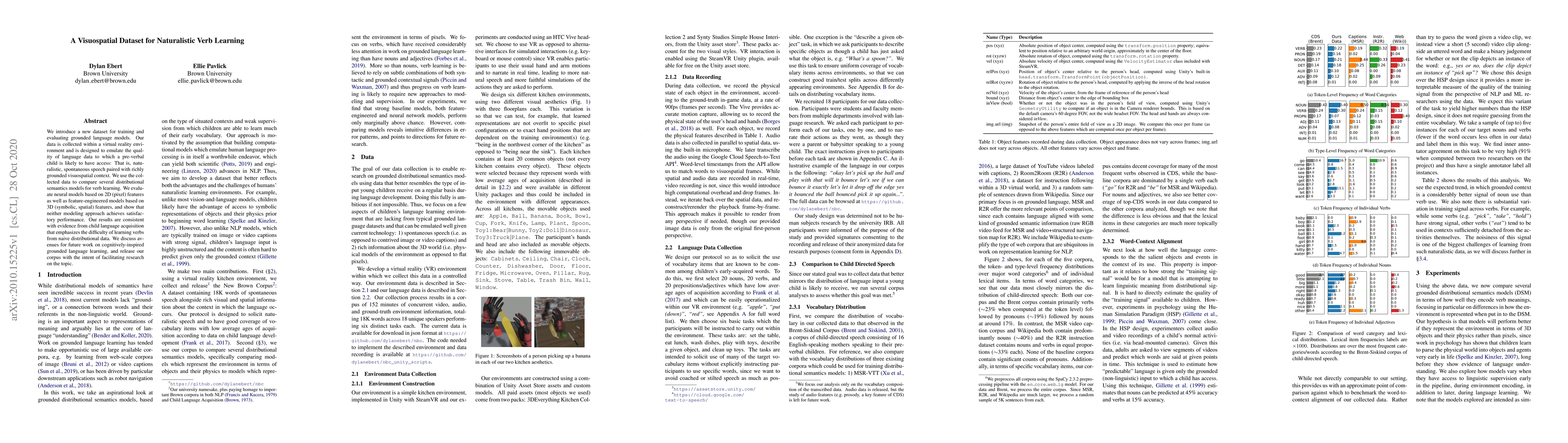 We introduce a new dataset for training and evaluating grounded language models. Our data is collected within a virtual reality environment and is designed to emulate the quality of language data to which a pre-verbal child is likely to have access: That is, naturalistic, spontaneous speech paired with richly grounded visuospatial context. We use the collected data to compare several distributional semantics models for verb learning. We evaluate neural models based on 2D (pixel) features as well as feature-engineered models based on 3D (symbolic, spatial) features, and show that neither modeling approach achieves satisfactory performance. Our results are consistent with evidence from child language acquisition that emphasizes the difficulty of learning verbs from naive distributional data. We discuss avenues for future work on cognitively-inspired grounded language learning, and release our corpus with the intent of facilitating research on the topic.