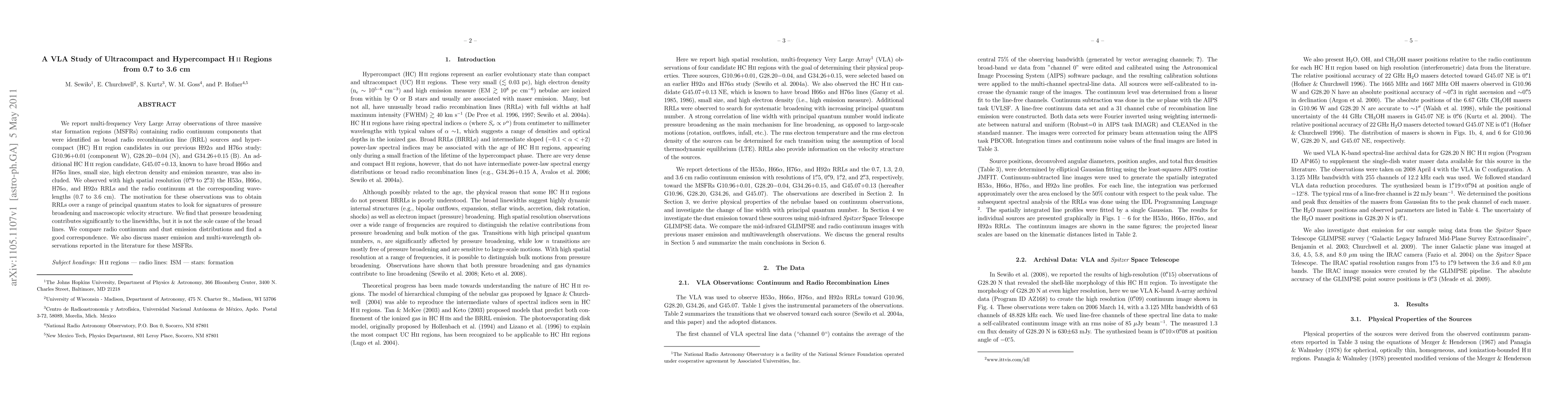 We report multi-frequency Very Large Array observations of three massive star formation regions (MSFRs) containing radio continuum components that were identified as broad radio recombination line (RRL) sources and hypercompact (HC) H II region candidates in our previous H92alpha and H76alpha study: G10.96+0.01 (component W), G28.20-0.04 (N), and G34.26+0.15 (B). An additional HC H II region candidate, G45.07+0.13, known to have broad H66alpha and H76alpha lines, small size, high electron density and emission measure, was also included. We observed with high spatial resolution (0.9" to 2.3") the H53alpha, H66alpha, H76alpha, and H92alpha RRLs and the radio continuum at the corresponding wavelengths (0.7 to 3.6 cm). The motivation for these observations was to obtain RRLs over a range of principal quantum states to look for signatures of pressure broadening and macroscopic velocity structure. We find that pressure broadening contributes significantly to the line widths, but it is not the sole cause of the broad lines. We compare radio continuum and dust emission distributions and find a good correspondence. We also discuss maser emission and multi-wavelength observations reported in the literature for these MSFRs.