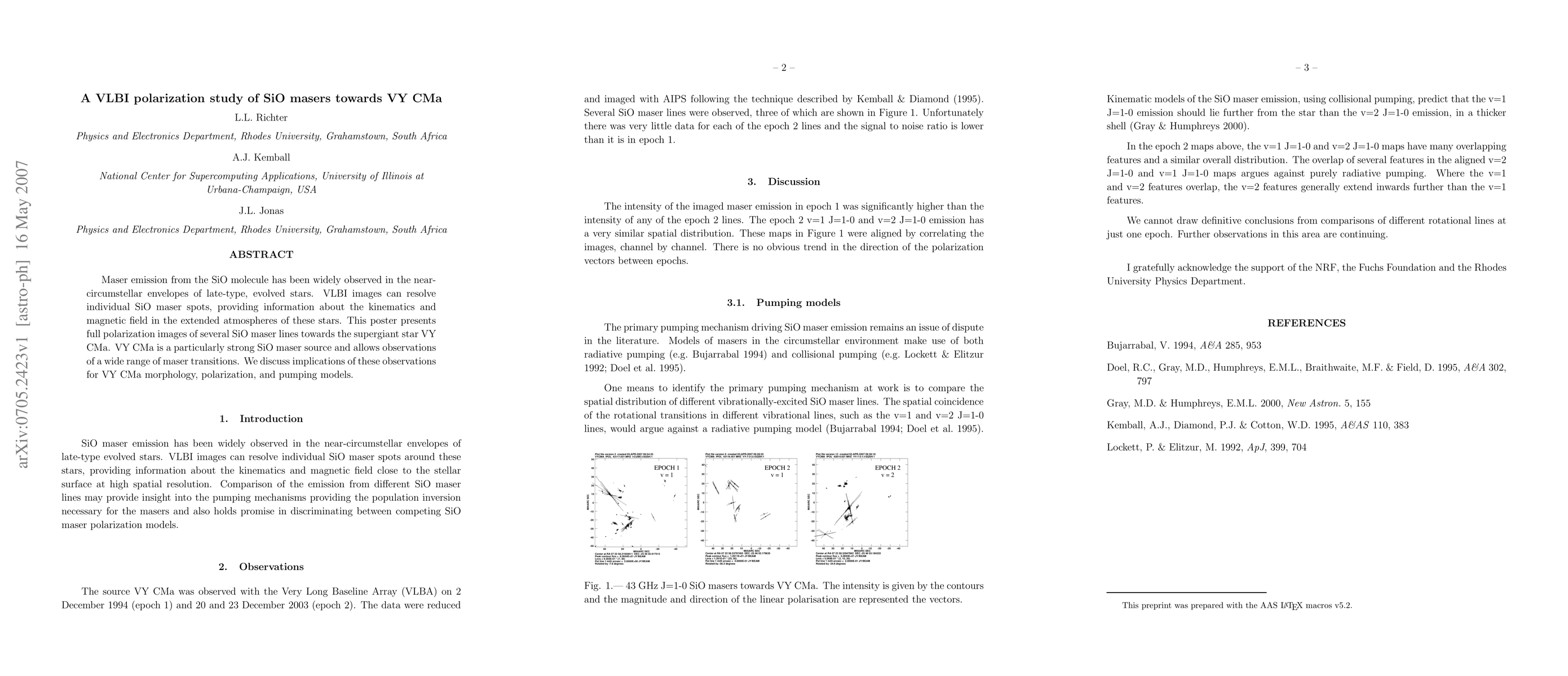 This study uses VLBI to obtain full polarization images of SiO maser lines towards the supergiant star VY CMa, revealing detailed insights into the star's morphology, magnetic field, and maser pumping mechanisms. The findings provide valuable data on the kinematics and polarization of maser spots in the star's extended atmosphere.