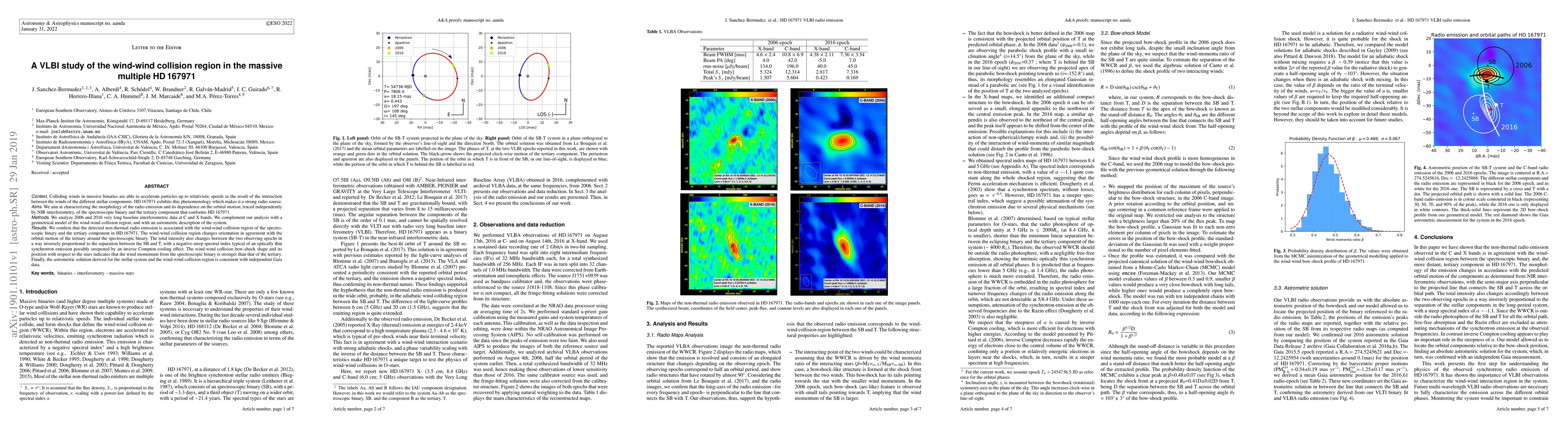 Context. Colliding winds in massive binaries are able to accelerate particles up to relativistic speeds as the result of the interaction between the winds of the different stellar components. HD 167971 exhibits this phenomenology which makes it a strong radio source. Aims. We aim at characterizing the morphology of the radio emission and its dependence on the orbital motion, traced independently by NIR-interferometry, of the spectroscopic binary and the tertiary component that conforms HD 167971. Methods. We analyze 2006 and 2016 very long baseline interferometric data at C and X bands. We complement our analysis with a geometrical model of the wind-wind collision region, and with an astrometric description of the system. Results. We confirm that the detected non-thermal radio emission is associated with the wind-wind collision region of the spectroscopic binary and the tertiary component in HD 167971. The wind-wind collision region changes orientation in agreement with the orbital motion of the tertiary around the spectroscopic binary. The total intensity also changes between the two observing epochs in a way inversely proportional to the separation between the SB and T, with a negative-steep spectral index typical of an optically thin synchrotron emission possibly steepened by an inverse Compton cooling effect. The wind-wind collision bow-shock shape and its position with respect to the stars indicates that the wind momentum from the spectroscopic binary is stronger than that of the tertiary. Finally, the astrometric solution derived for the stellar system and the wind-wind collision region is consistent with independent Gaia data.