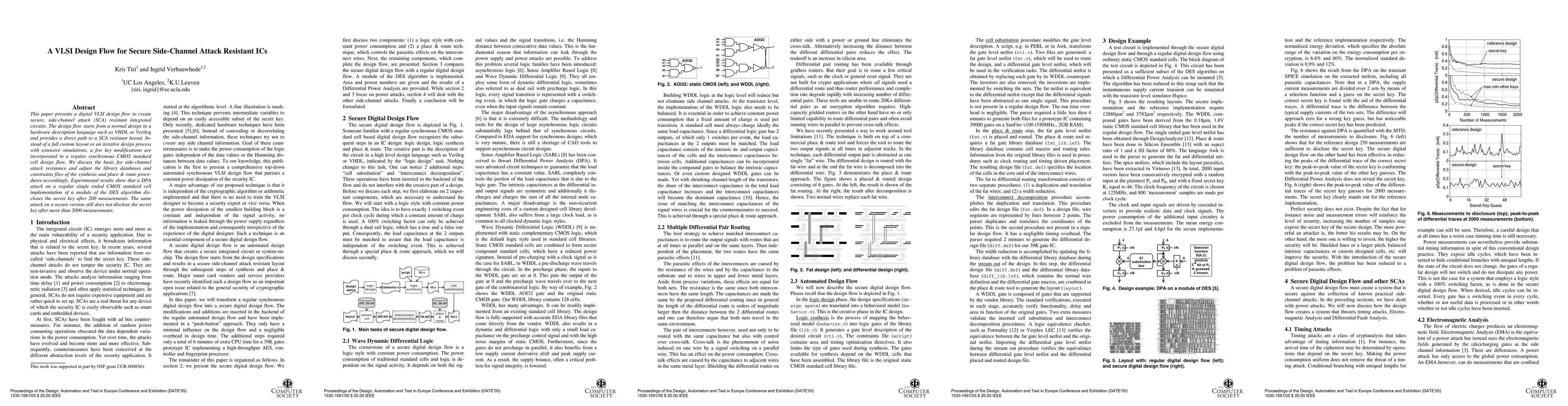 This paper introduces a streamlined VLSI design flow for creating secure, side-channel attack resistant integrated circuits by modifying standard CMOS design processes. Experimental results demonstrate significant resistance to differential power analysis attacks, with the secure version resisting key disclosure after 2000 measurements compared to 200 for a regular implementation.