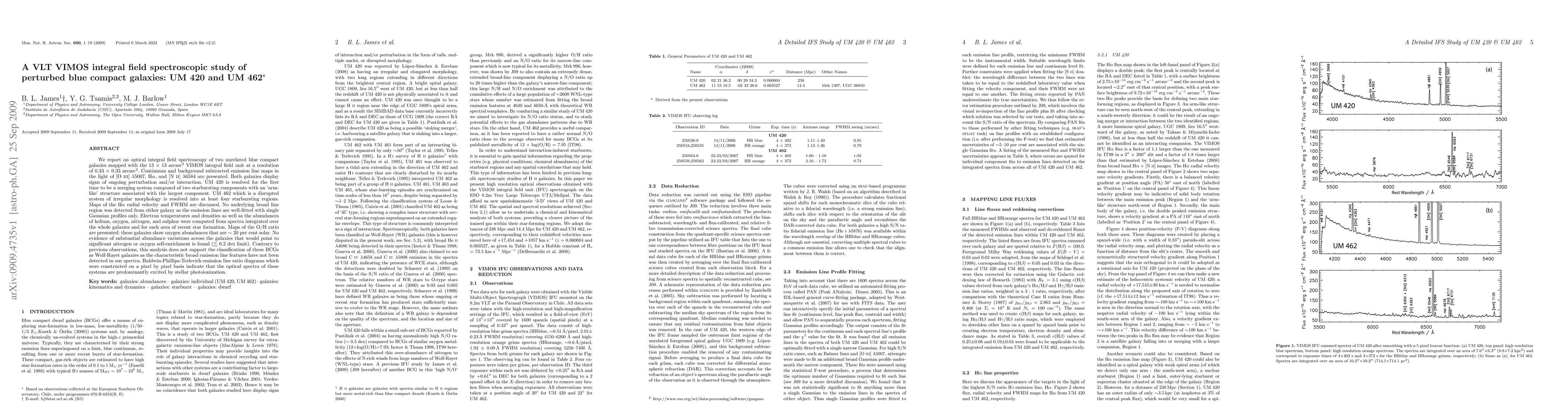 We report on optical integral field spectroscopy of two unrelated blue compact galaxies mapped with the 13 x 13 arcsec^2 VIMOS integral field unit at a resolution of 0.33 x 0.33 arcsec^2. Continuum and background subtracted emission line maps in the light of [O III] 5007, H-alpha, and [N II] 6584 are presented. Both galaxies display signs of ongoing perturbation and/or interaction. UM 420 is resolved for the first time to be a merging system composed of two starbursting components with an 'arm-like' structure associated with the largest component. UM 462 which is a disrupted system of irregular morphology is resolved into at least four starbursting regions. Maps of the H-alpha radial velocity and FWHM are discussed. No underlying broad line region was detected from either galaxy as the emission lines are well-fitted with single Gaussian profiles only. Electron temperatures and densities as well as the abundances of helium, oxygen, nitrogen, and sulphur were computed from spectra integrated over the whole galaxies and for each area of recent star formation. Maps of the O/H ratio are presented: these galaxies show oxygen abundances that are ~20 per cent solar. No evidence of substantial abundance variations across the galaxies that would point to significant nitrogen or oxygen self-enrichment is found (<0.2 dex limit). Contrary to previous observations, this analysis does not support the classification of these BCGs as Wolf-Rayet galaxies as the characteristic broad emission line features have not been detected in our spectra. Baldwin-Phillips-Terlevich emission line ratio diagrams which were constructed on a pixel by pixel basis indicate that the optical spectra of these systems are predominantly excited by stellar photoionization.