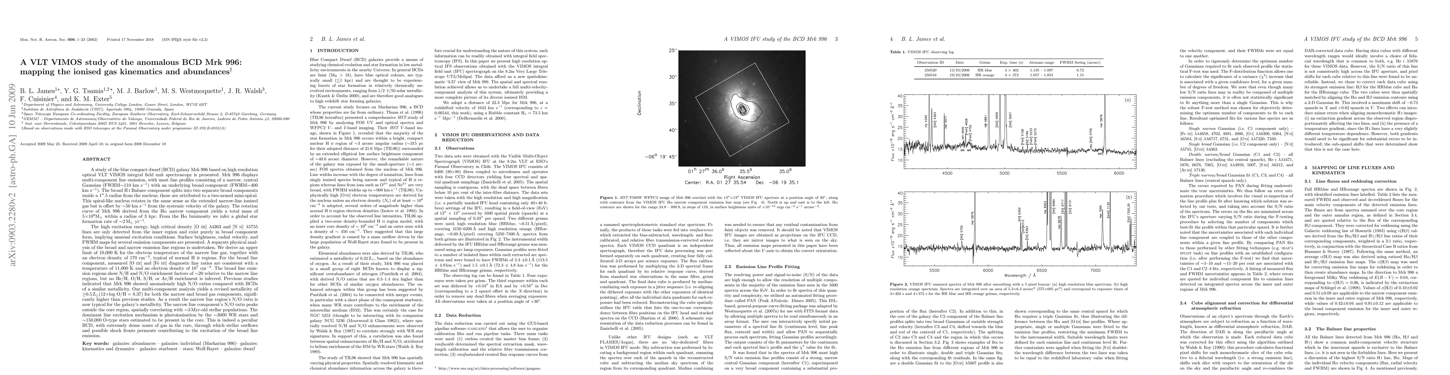 This study uses VLT VIMOS spectroscopy to analyze the kinematics and abundances of ionised gas in the BCD galaxy Mrk 996, revealing a complex structure with broad and narrow emission components. The broad HI Balmer component splits into two within a 1.5" radius, suggesting a two-armed mini-spiral. The galaxy's core hosts dense gas zones, photoionized by numerous WR and O-type stars, with unusual excitation conditions and significant nitrogen enrichment.