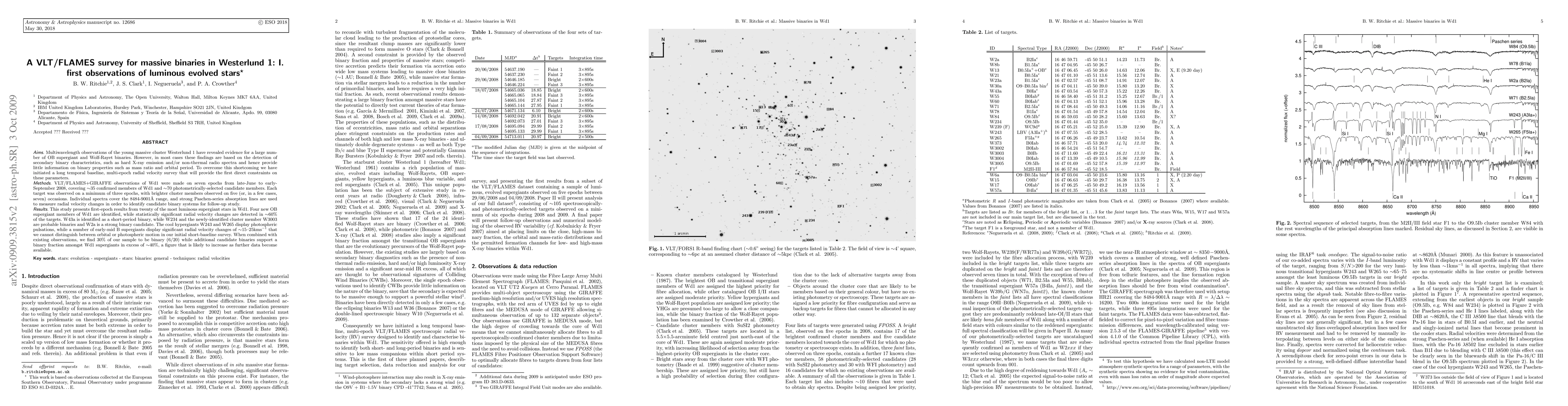 This VLT/FLAMES survey of Westerlund 1's luminous evolved stars reveals that ~60% of the observed supergiant stars show statistically significant radial velocity changes, indicating binary systems. Among the targets, W43a is confirmed as a short-period binary, while W234, W3003, and W2a are probable binaries, suggesting a binary fraction exceeding 40% among the supergiants in the cluster.