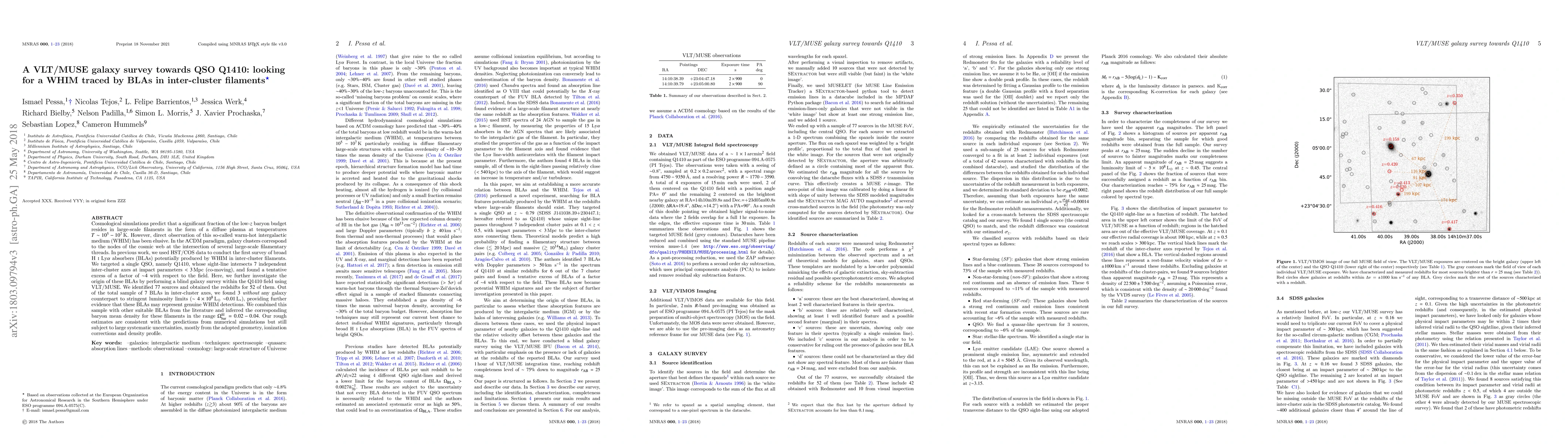 Cosmological simulations predict that a significant fraction of the low-$z$ baryon budget resides in large-scale filaments in the form of a diffuse plasma at temperatures $T \sim 10^{5} - 10^{7}$ K. However, direct observation of this so-called warm-hot intergalactic medium (WHIM) has been elusive. In the $\Lambda$CDM paradigm, galaxy clusters correspond to the nodes of the cosmic web at the intersection of several large-scale filamentary threads. In previous work, we used HST/COS data to conduct the first survey of broad HI Ly$\alpha$ absorbers (BLAs) potentially produced by WHIM in inter-cluster filaments. We targeted a single QSO, namely Q1410, whose sight-line intersects $7$ independent inter-cluster axes at impact parameters $<3$ Mpc (co-moving), and found a tentative excess of a factor of ${\sim}4$ with respect to the field. Here, we further investigate the origin of these BLAs by performing a blind galaxy survey within the Q1410 field using VLT/MUSE. We identified $77$ sources and obtained the redshifts for $52$ of them. Out of the total sample of $7$ BLAs in inter-cluster axes, we found $3$ without any galaxy counterpart to stringent luminosity limits ($\sim 4 \times 10^{8}$ L$_{\odot}$ ${\sim} 0.01$ L$_{*}$), providing further evidence that these BLAs may represent genuine WHIM detections. We combined this sample with other suitable BLAs from the literature and inferred the corresponding baryon mean density for these filaments in the range $\Omega^{\rm fil}_{\rm bar}= 0.02-0.04$. Our rough estimates are consistent with the predictions from numerical simulations but still subject to large systematic uncertainties, mostly from the adopted geometry, ionization corrections and density profile.