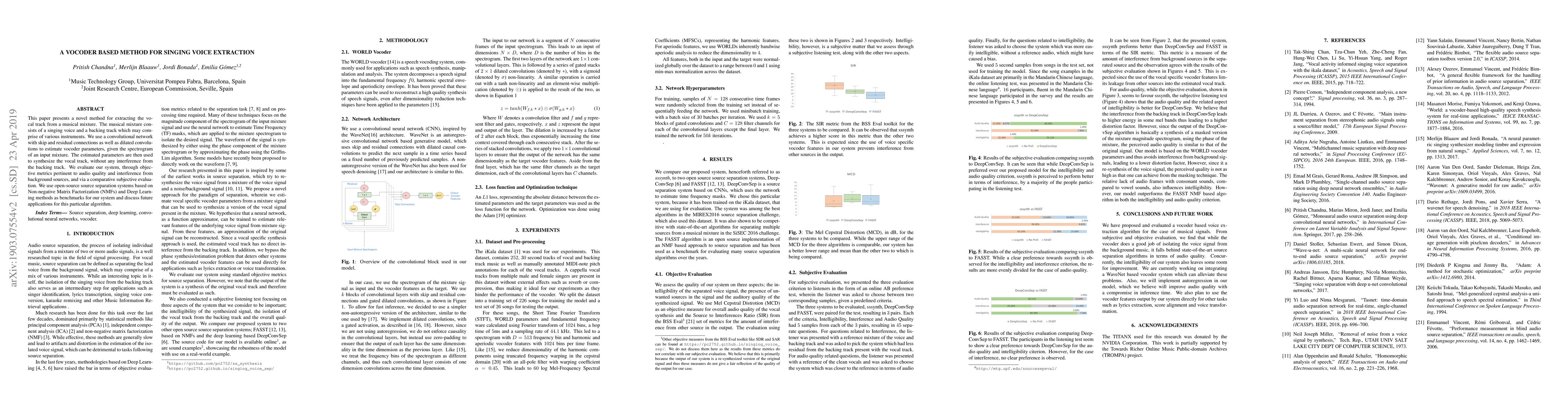 A novel vocoder-based method extracts singing voice from musical mixtures using a convolutional network, achieving accurate audio quality and separating background noise.