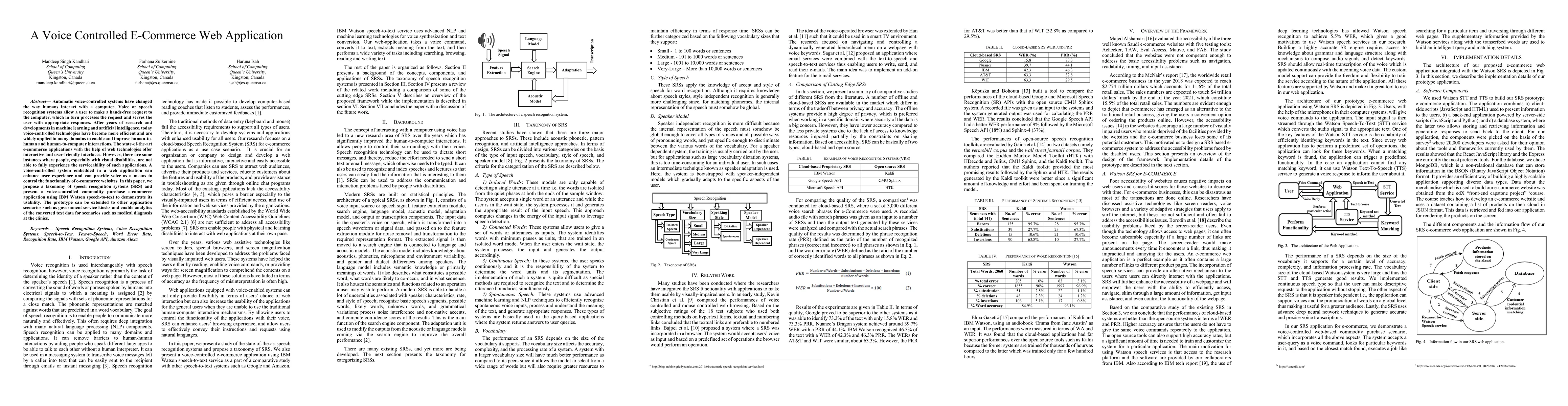 Automatic voice-controlled systems have changed the way humans interact with a computer. Voice or speech recognition systems allow a user to make a hands-free request to the computer, which in turn processes the request and serves the user with appropriate responses. After years of research and developments in machine learning and artificial intelligence, today voice-controlled technologies have become more efficient and are widely applied in many domains to enable and improve human-to-human and human-to-computer interactions. The state-of-the-art e-commerce applications with the help of web technologies offer interactive and user-friendly interfaces. However, there are some instances where people, especially with visual disabilities, are not able to fully experience the serviceability of such applications. A voice-controlled system embedded in a web application can enhance user experience and can provide voice as a means to control the functionality of e-commerce websites. In this paper, we propose a taxonomy of speech recognition systems (SRS) and present a voice-controlled commodity purchase e-commerce application using IBM Watson speech-to-text to demonstrate its usability. The prototype can be extended to other application scenarios such as government service kiosks and enable analytics of the converted text data for scenarios such as medical diagnosis at the clinics.