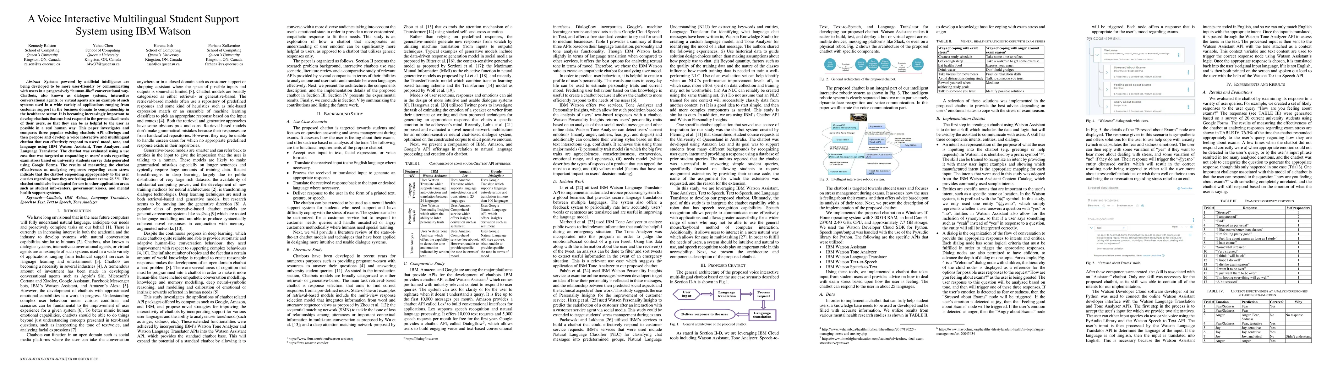 This paper develops a voice interactive, multilingual chatbot using IBM Watson to support university students, particularly in addressing exam stress. The chatbot, leveraging Watson Assistant, Tone Analyzer, and Language Translator, was evaluated based on student survey data, showing 76.5% effectiveness in responding to users' emotional states regarding exams.