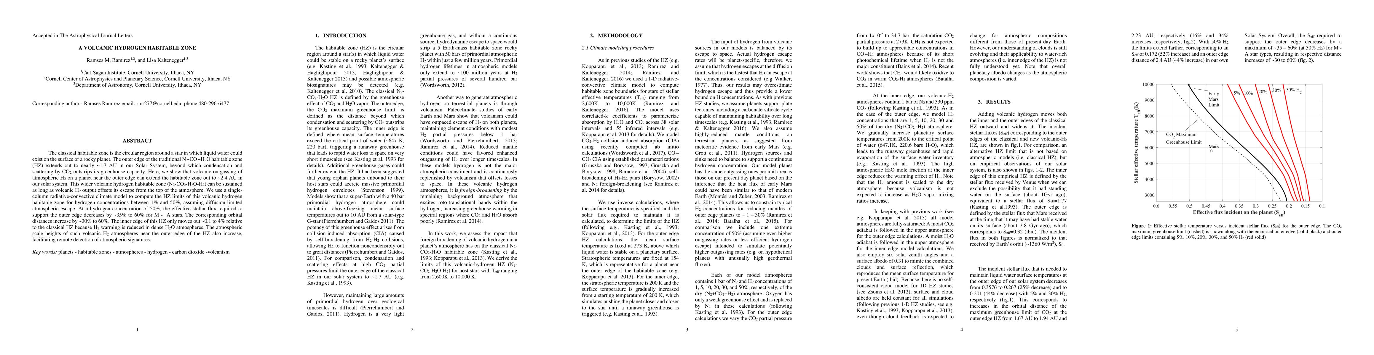 This paper explores the extension of the habitable zone beyond the traditional limits by volcanic hydrogen outgassing, which can sustain liquid water on a planet's surface up to 2.4 AU in our solar system. The study finds that a hydrogen-rich atmosphere can lower the required stellar flux and increase the habitable zone's orbital distance, especially for M to A stars.