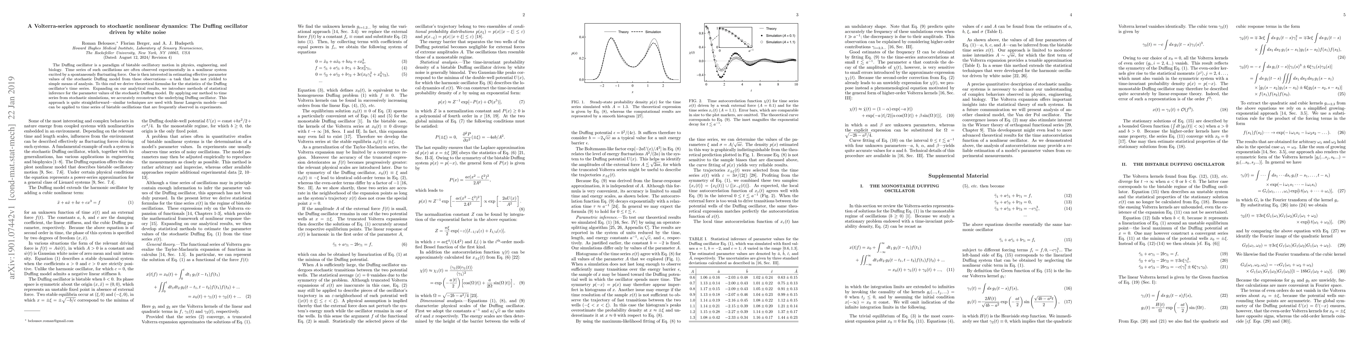 This paper introduces a Volterra-series approach to analyze the stochastic nonlinear dynamics of the Duffing oscillator driven by white noise. The authors develop statistical inference methods to estimate effective parameters from experimental time series, successfully reconstructing the underlying oscillator model from stochastic simulations.