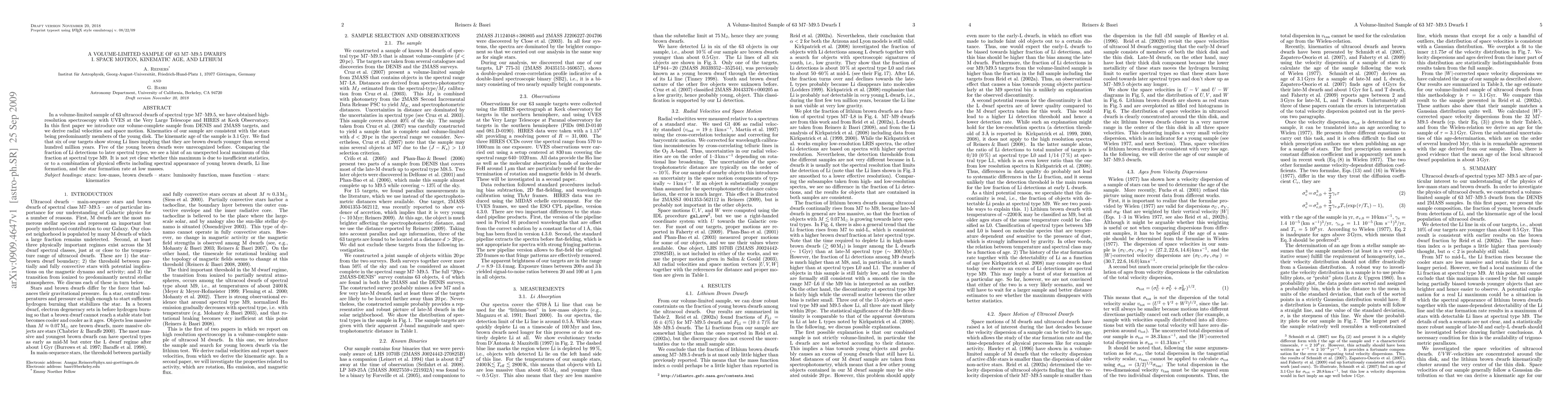 This paper presents a volume-limited sample of 63 M7-M9.5 ultracool dwarfs, deriving their space motion and kinematic age of 3.1 Gyr, indicating they are predominantly young disk members. Six targets show strong lithium lines, suggesting they are young brown dwarfs, five of which were previously unrecognized.