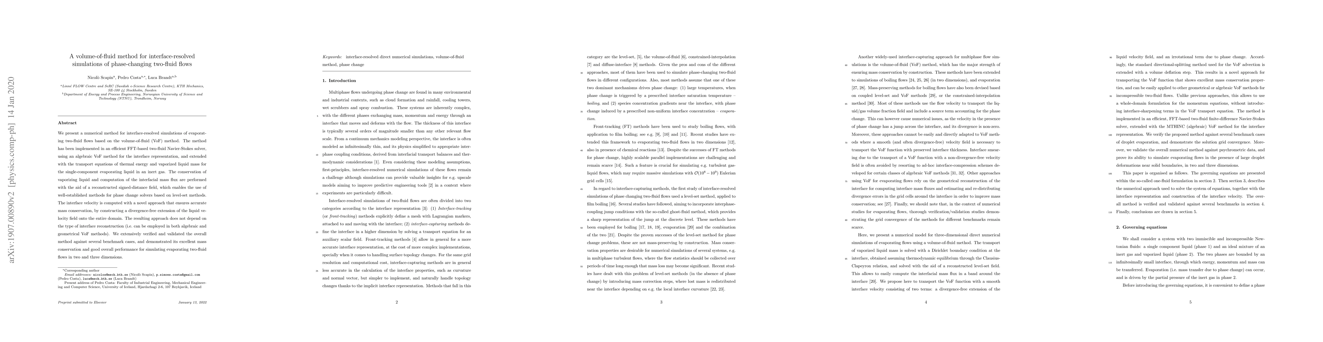 This paper introduces a volume-of-fluid method for simulating evaporating two-fluid flows, implemented in an FFT-based solver, which ensures accurate mass conservation and interface velocity computation. The method is validated against benchmark cases, demonstrating effective simulation of phase-changing flows.