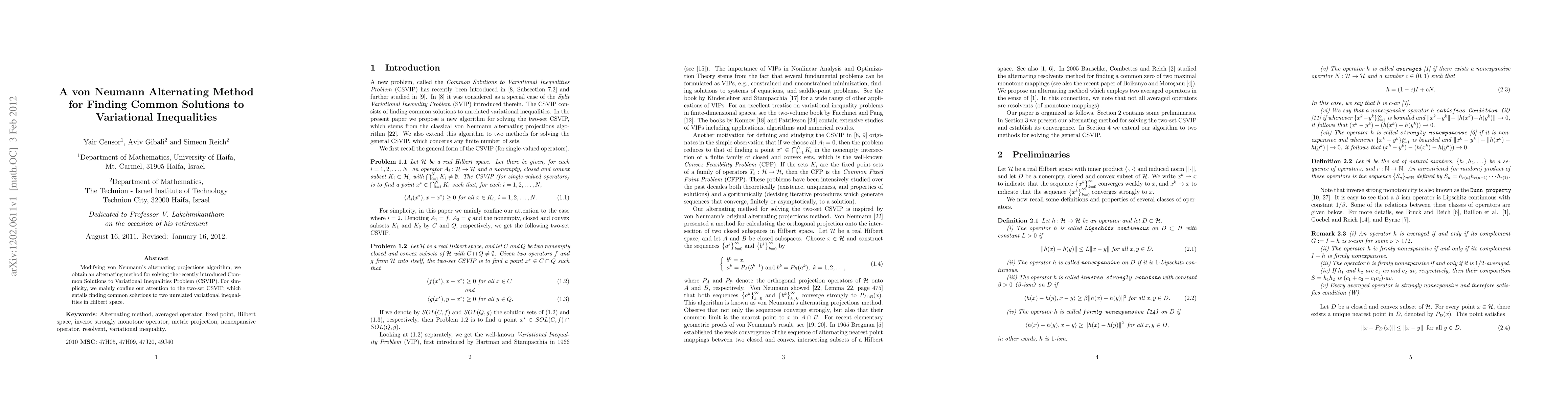 Summary: This paper proposes a modified von Neumann alternating method for solving the Common Solutions to Variational Inequalities Problem (CSVIP), focusing on the two-set variant in Hilbert space, which aims to find common solutions to two unrelated variational inequalities. The method leverages alternating projections to achieve this solution.