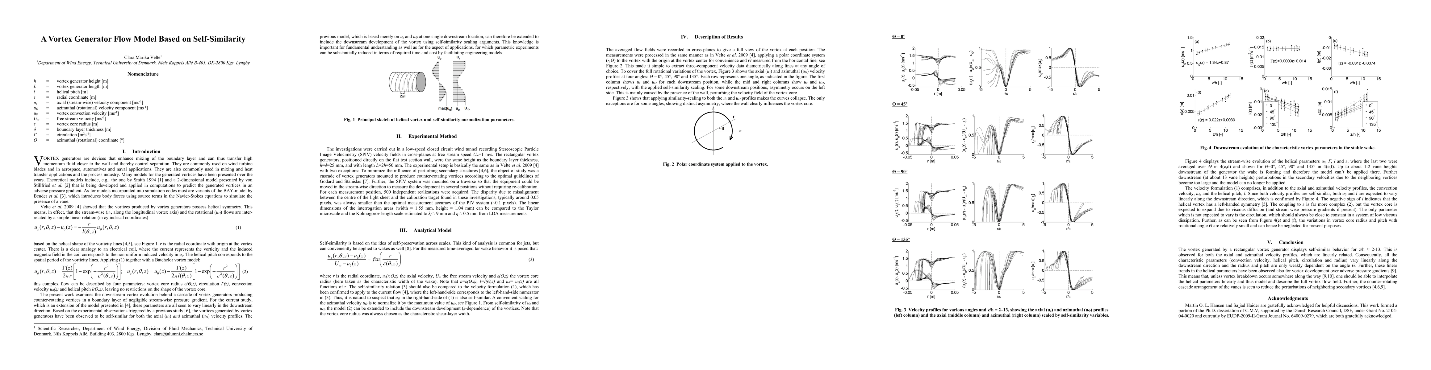 The present work examines the downstream vortex evolution behind a cascade of vortex generators producing counter-rotating vortices in a boundary layer of negligible streamwise pressure gradient. For the current study, which is an extension of the model presented in [4], these parameters are all seen to vary linearly in the downstream direction. Based on the experimental observations triggered by a previous study, the vortices generated by vortex generators have been observed to be self-similar for both the axial ($u_z$) and azimuthal ($u_{\theta}$) velocity profiles. The previous model, which is based merely on $u_z$ and $u_{\theta}$ at one single downstream location, can therefore be extended to include the downstream development of the vortex using self-similarity scaling arguments. This knowledge is important for fundamental understanding as well as for the aspect of applications, for which parametric experiments can be substantially reduced in terms of required time and cost by facilitating engineering models.