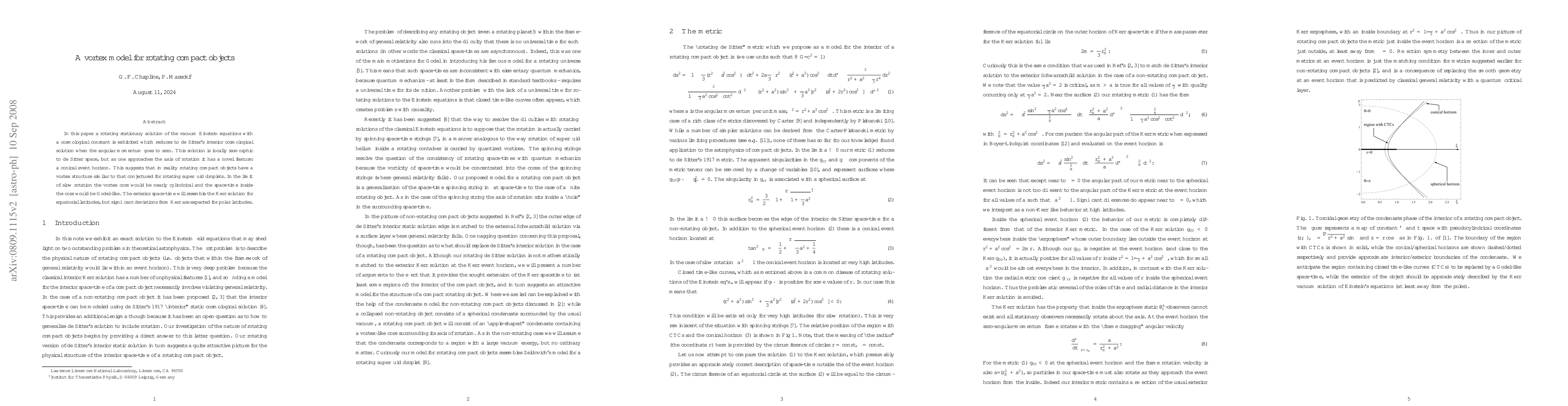 Researchers discovered a rotating compact object vortex model that closely resembles de Sitter's interior cosmological solution, suggesting such objects have a vortex-like structure similar to superfluid droplets.