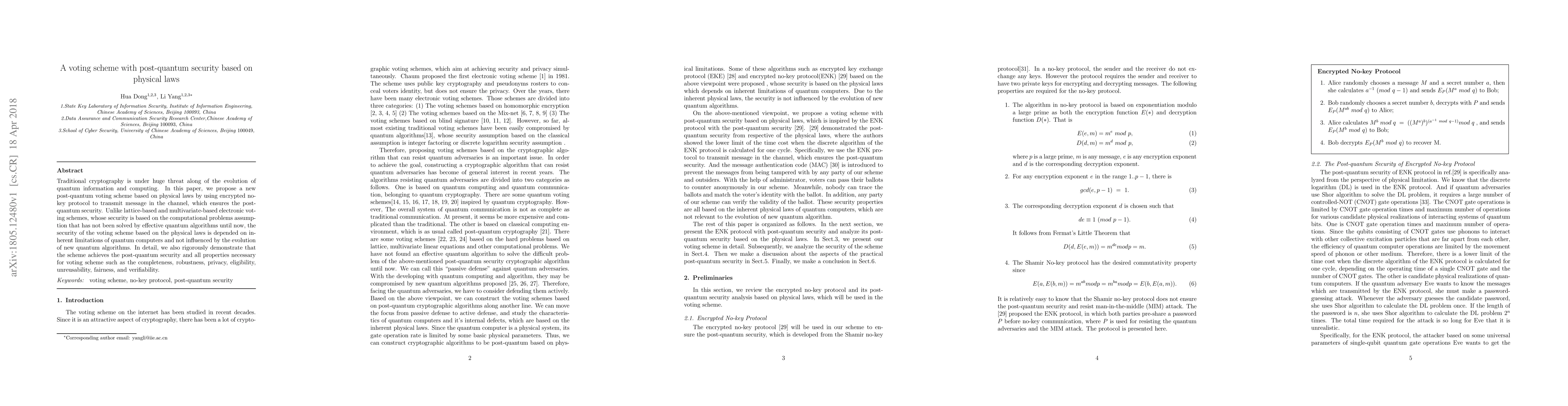 This paper proposes a new post-quantum secure voting scheme based on physical laws, ensuring security through inherent quantum computer limitations rather than computational assumptions. The scheme demonstrates post-quantum security and fulfills essential voting properties like completeness, privacy, and fairness.