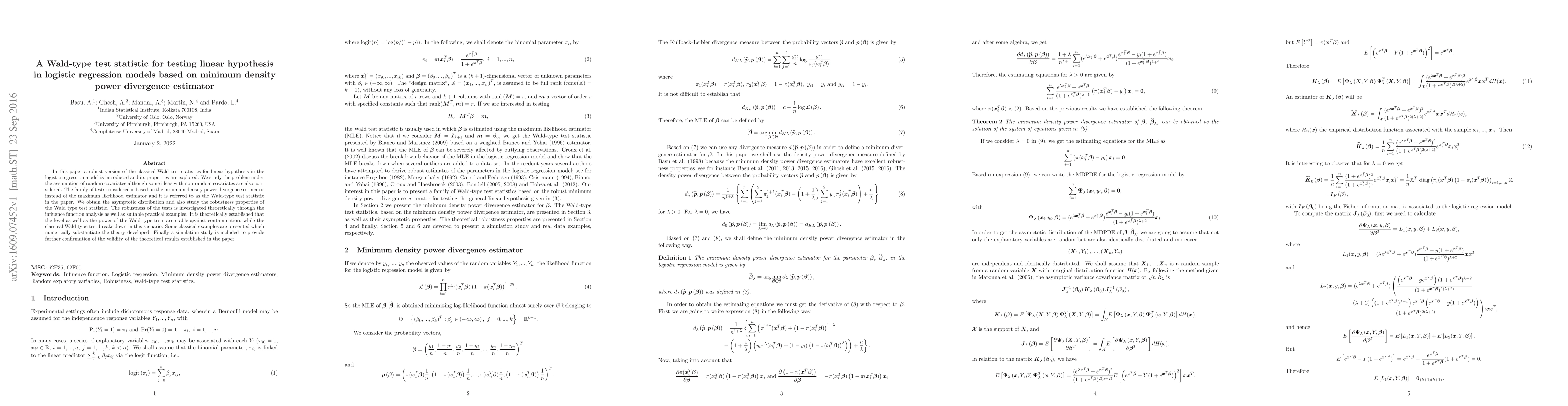 This paper introduces a robust Wald-type test statistic for logistic regression models based on the minimum density power divergence estimator, demonstrating its stability against contamination compared to the classical Wald test, supported by theoretical analysis and practical examples. A simulation study further confirms the theoretical robustness findings.