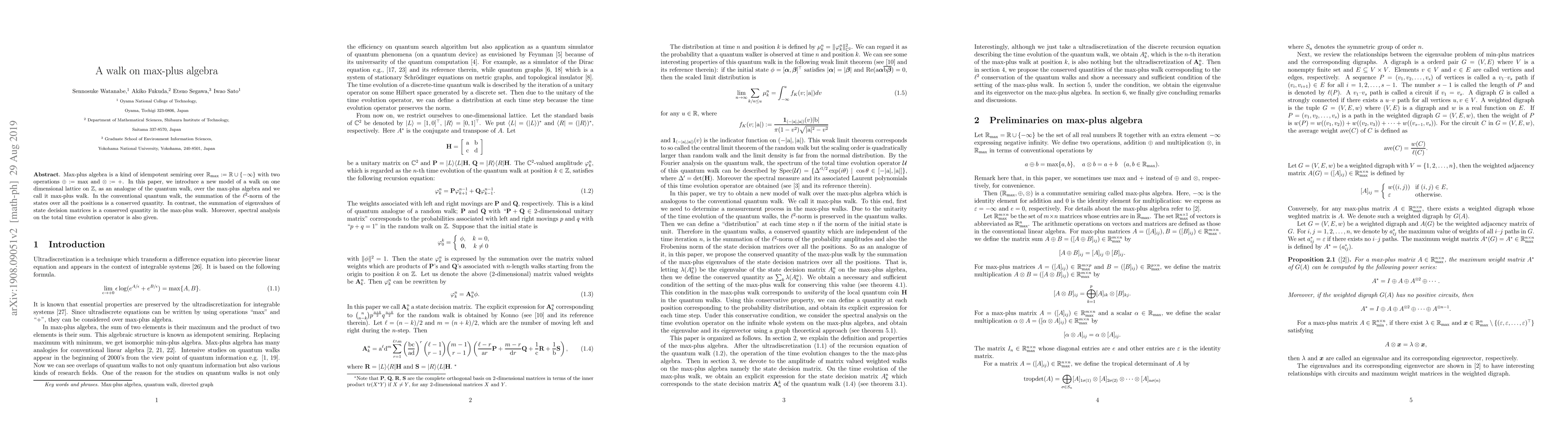 Max-plus algebra is a kind of idempotent semiring over $\mathbb{R}_{\max}:=\mathbb{R}\cup\{-\infty\}$ with two operations $\oplus := \max$ and $\otimes := +$.In this paper, we introduce a new model of a walk on one dimensional lattice on $\mathbb{Z}$, as an analogue of the quantum walk, over the max-plus algebra and we call it max-plus walk. In the conventional quantum walk, the summation of the $\ell^2$-norm of the states over all the positions is a conserved quantity. In contrast, the summation of eigenvalues of state decision matrices is a conserved quantity in the max-plus walk.Moreover, spectral analysis on the total time evolution operator is also given.