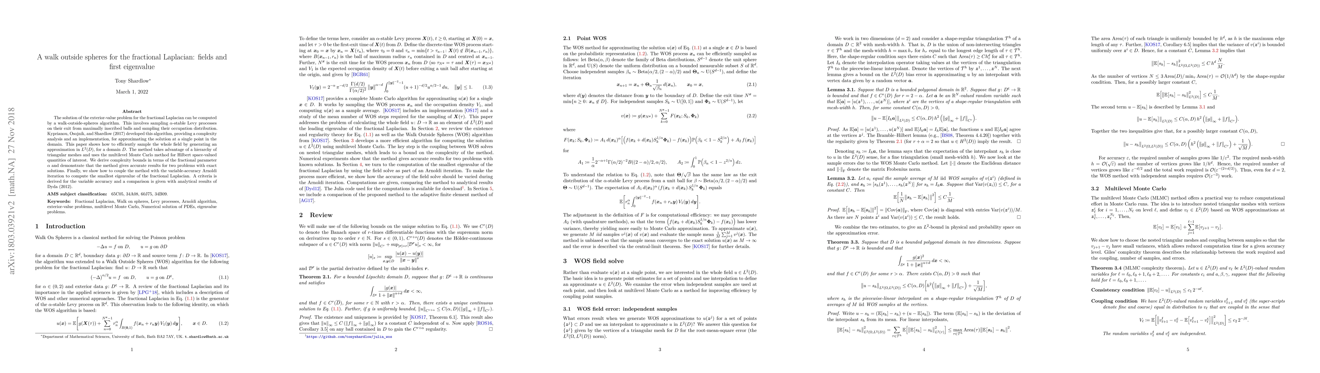 The Feynman-Kac formula for the exterior-value problem for the fractional Laplacian leads to a walk-outside-spheres algorithm via sampling alpha-stable Levy processes on their exit from maximally inscribed balls and sampling their occupation distribution. Kyprianou, Osojnik, and Shardlow (2017) developed this algorithm, providing a complexity analysis and an implementation, for approximating the solution at a single point in the domain. This paper shows how to efficiently sample the whole field by generating an approximation in L_2(D), for a domain D . The method takes advantage of a hierarchy of triangular meshes and uses the multilevel Monte Carlo method for Hilbert space-valued quantities of interest. We derive complexity bounds in terms of the fractional parameter alpha and demonstrate that the method gives accurate results for two problems with exact solutions. Finally, we show how to couple the method with the variable-accuracy Arnoldi iteration to compute the smallest eigenvalue of the fractional Laplacian. A criteria is derived for the variable accuracy and a comparison is given with analytical results of Dyda (2012).