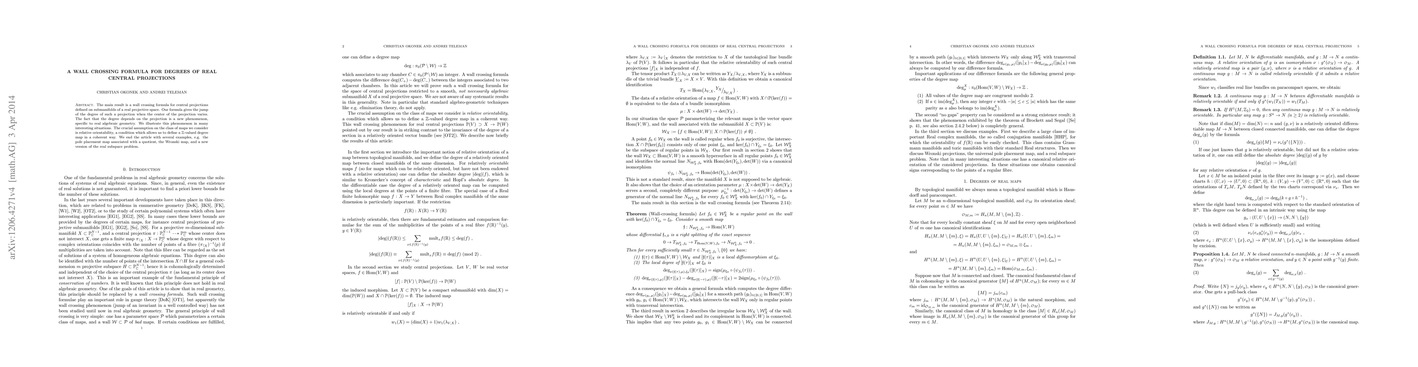 The main result is a wall crossing formula for central projections defined on submanifolds of a real projective space. Our formula gives the jump of the degree of such a projection when the center of the projection varies. The fact that the degree depends on the projection is a new phenomenon, specific to real algebraic geometry. We illustrate this phenomenon in many interesting situations. The crucial assumption on the class of maps we consider is relative orientability, a condition which allows us to define a $\Z$-valued degree map in a coherent way. We end the article with several examples, e.g. the pole placement map associated with a quotient, the Wronski map, and a new version of the real subspace problem.