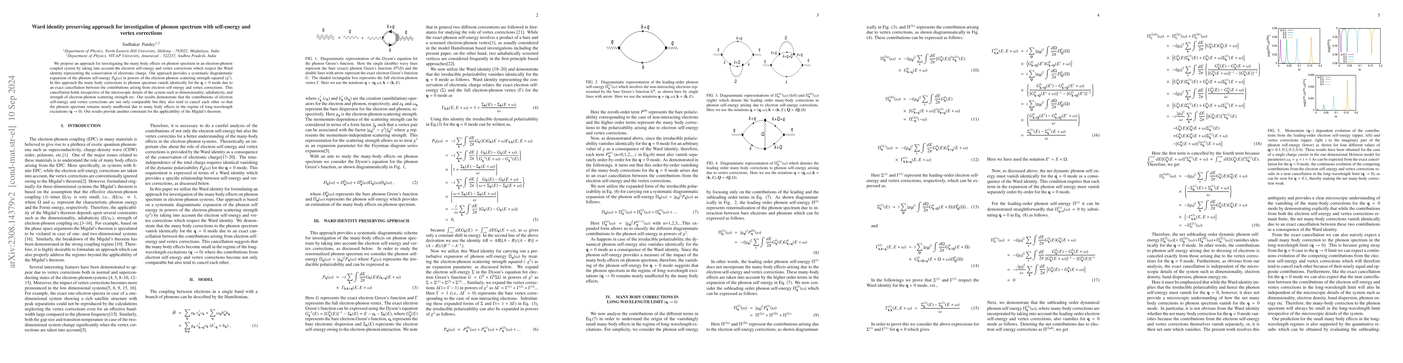 We propose an approach for investigating the many body effects on phonon spectrum in an electron-phonon coupled system by taking into account the electron self-energy and vertex corrections which respect the Ward identity representing the conservation of electronic charge. Our approach provides a systematic diagrammatic expansion of the phonon self-energy $\Pi(\mathbf{q},\omega)$ in powers of the electron-phonon scattering strength $(g^2)$. In this approach the many body corrections to phonon spectrum vanish identically in the regime of long-wavelength excitations ($\mathbf{q} \rightarrow 0$) due to an exact cancellation between the contributions arising from electron self-energy and vertex corrections. Our results demonstrate that the contributions of electron self-energy and vertex corrections are not only comparable but they also tend to cancel each oher so that the phonon spectrum remains nearly unaffected due to many body effects in the regime of long-wavelength excitations ($\mathbf{q} \rightarrow 0$)