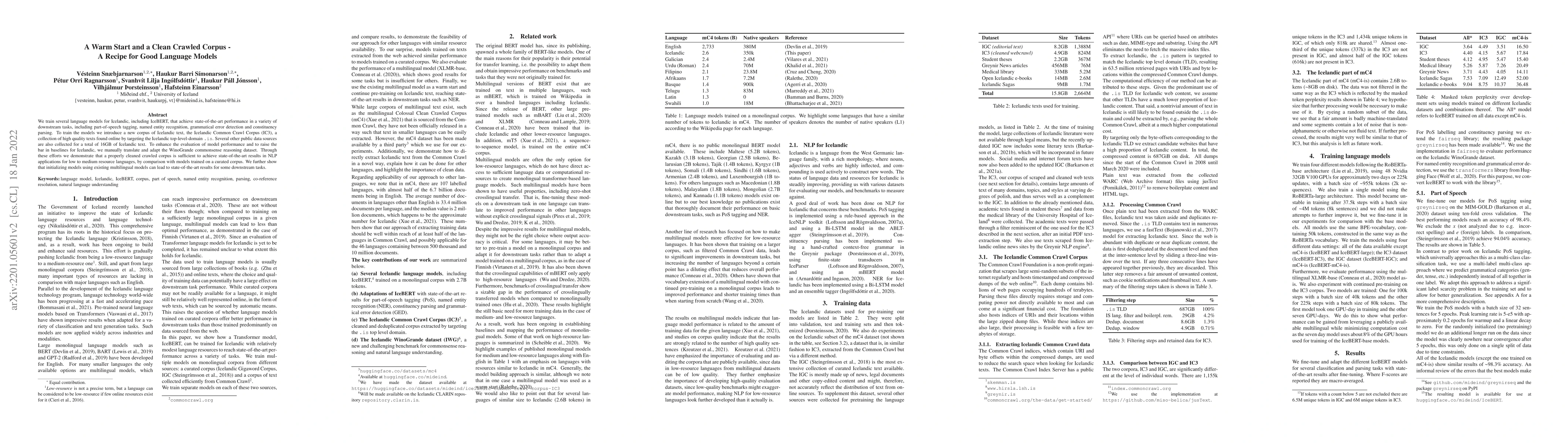 We train several language models for Icelandic, including IceBERT, that achieve state-of-the-art performance in a variety of downstream tasks, including part-of-speech tagging, named entity recognition, grammatical error detection and constituency parsing. To train the models we introduce a new corpus of Icelandic text, the Icelandic Common Crawl Corpus (IC3), a collection of high quality texts found online by targeting the Icelandic top-level-domain (TLD). Several other public data sources are also collected for a total of 16GB of Icelandic text. To enhance the evaluation of model performance and to raise the bar in baselines for Icelandic, we translate and adapt the WinoGrande dataset for co-reference resolution. Through these efforts we demonstrate that a properly cleaned crawled corpus is sufficient to achieve state-of-the-art results in NLP applications for low to medium resource languages, by comparison with models trained on a curated corpus. We further show that initializing models using existing multilingual models can lead to state-of-the-art results for some downstream tasks.
