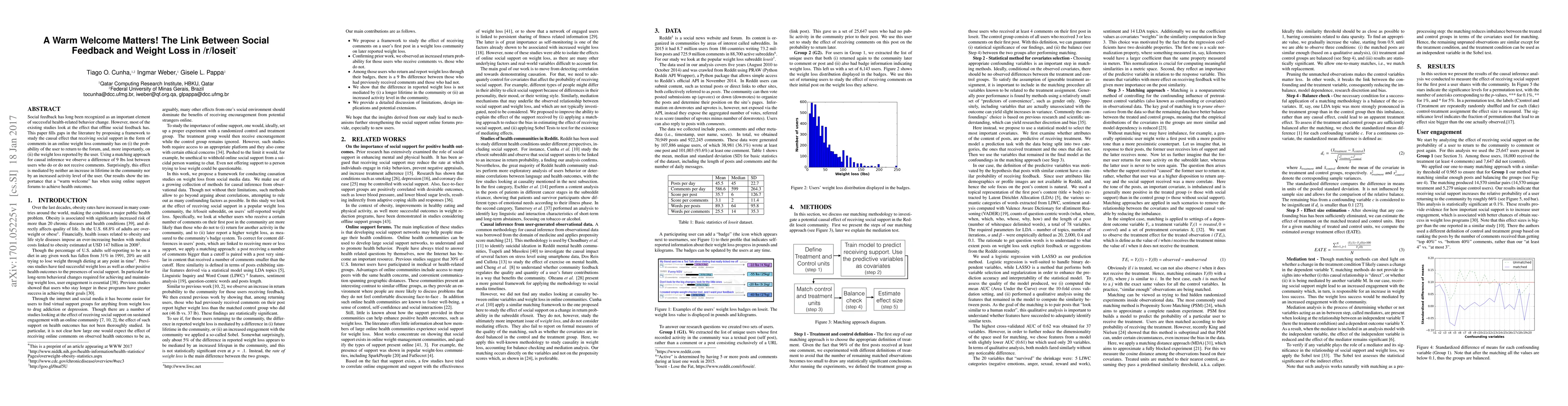 Social feedback has long been recognized as an important element of successful health-related behavior change. However, most of the existing studies look at the effect that offline social feedback has. This paper fills gaps in the literature by proposing a framework to study the causal effect that receiving social support in the form of comments in an online weight loss community has on (i) the probability of the user to return to the forum, and, more importantly, on (ii) the weight loss reported by the user. Using a matching approach for causal inference we observe a difference of 9 lbs lost between users who do or do not receive comments. Surprisingly, this effect is mediated by neither an increase in lifetime in the community nor by an increased activity level of the user. Our results show the importance that a "warm welcome" has when using online support forums to achieve health outcomes.