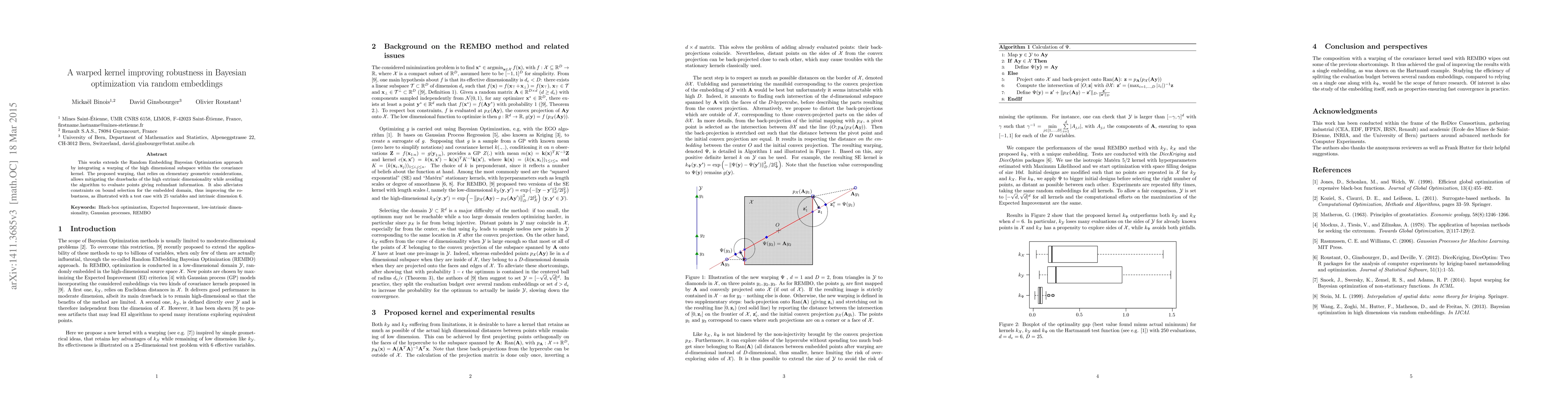 This research paper improves Bayesian optimization by integrating a warped kernel that reduces high-dimensional subspace dimensions while avoiding redundant evaluations, leading to improved robustness.