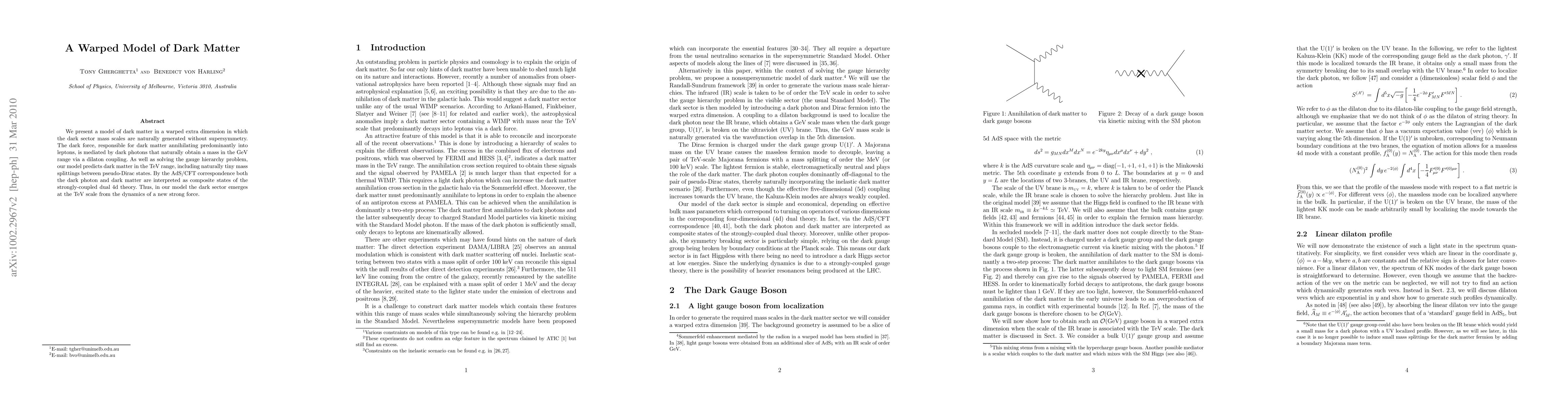 This paper proposes a dark matter model in a warped extra dimension where dark matter mass scales arise naturally without supersymmetry. The dark force, mediated by dark photons, predicts dark matter in the TeV range and solves the gauge hierarchy problem, with the dark sector emerging from a new strong force at the TeV scale.