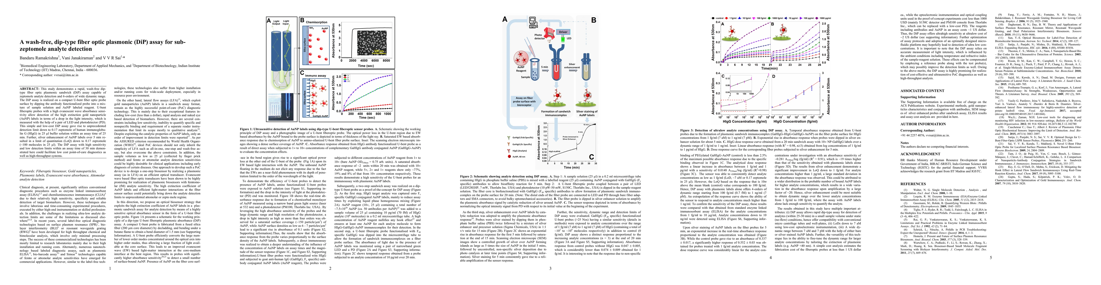 This study demonstrates a rapid, wash-free dip-type fiber optic plasmonic sandwich (DiP) assay capable of zeptomole analyte detection and 6-orders of wide dynamic range. The DiP assay is realized on a compact U-bent fiber optic probe surface by dipping the antibody functionalized probe into a mixture of sample solution and AuNP labeled reagent. U-bent fiberoptic probes with a high evanescent wave absorbance sensitivity allow detection of the high extinction gold nanoparticle (AuNP) labels in terms of a drop in the light intensity, which is measured with the help of a pair of LED and photodetector (PD). This simple and low-cost DiP assay gave rise to unprecedented detection limit down to 0.17 zeptomole of human immunoglobulin G (HIgG) in 0.025 ml buffer solution within an assay time of 25 min. Further, silver enhancement of AuNP labels over 5 min resulted in a limit of quantitation (LoQ) down to 0.17 zeptomole (~100 molecules in 0.025 ml). The DiP assay with high sensitivity and low detection limits within an assay time of 30 min demonstrated here could facilitate low cost point-of-care diagnostics as well as high-throughput systems.