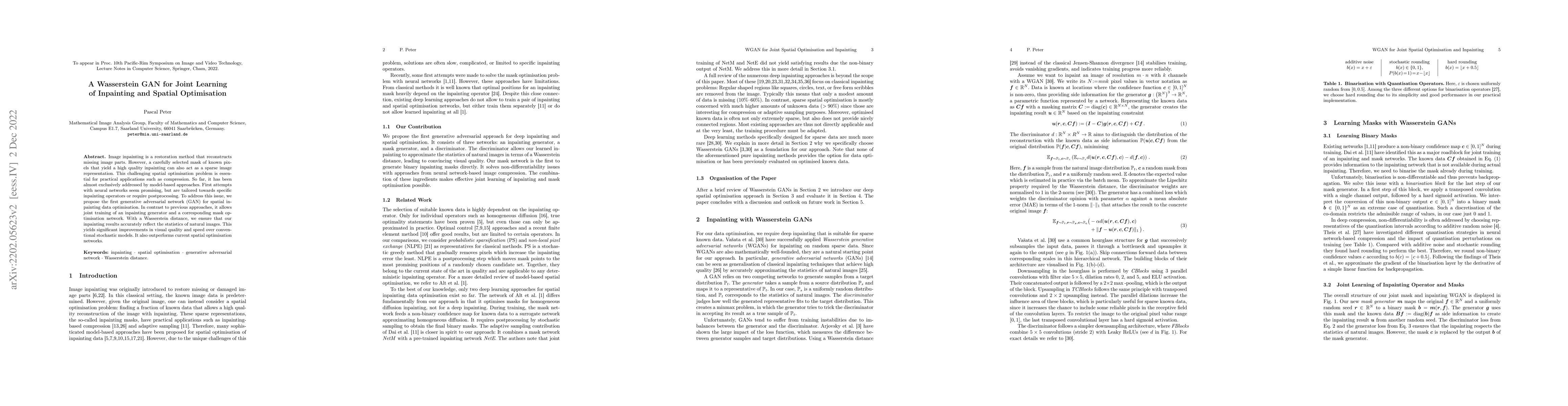 This paper proposes a Wasserstein GAN for jointly learning image inpainting and spatial optimisation, enabling the training of an inpainting generator and a mask optimisation network together. The use of Wasserstein distance enhances the visual quality and speed of inpainting results, outperforming existing spatial optimisation networks.