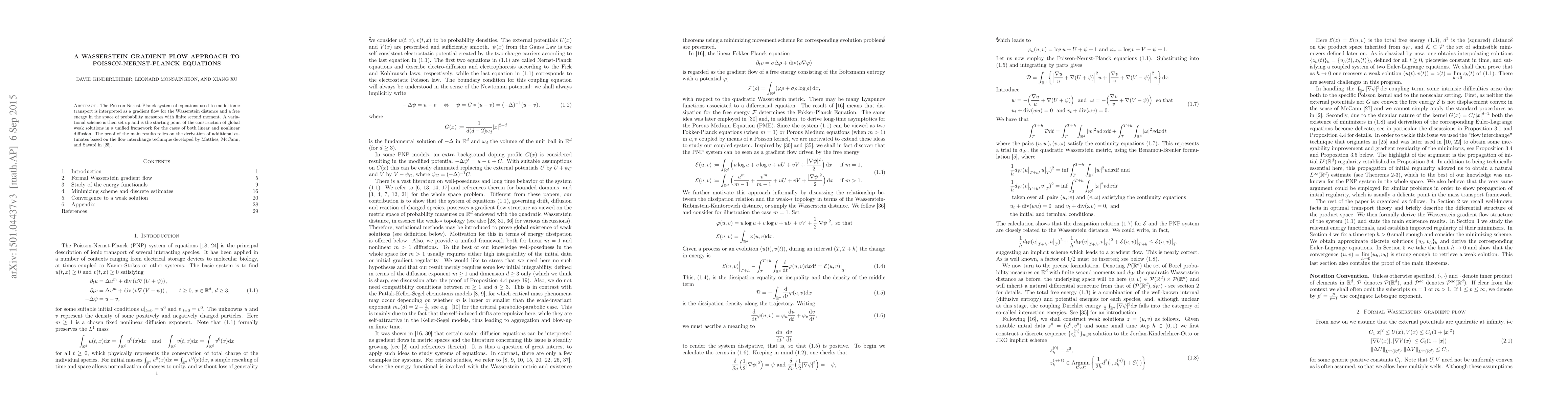 This paper interprets the Poisson-Nernst-Planck equations as a gradient flow for the Wasserstein distance, establishing a variational scheme to construct global weak solutions. The proof utilizes the flow interchange technique for additional estimates.