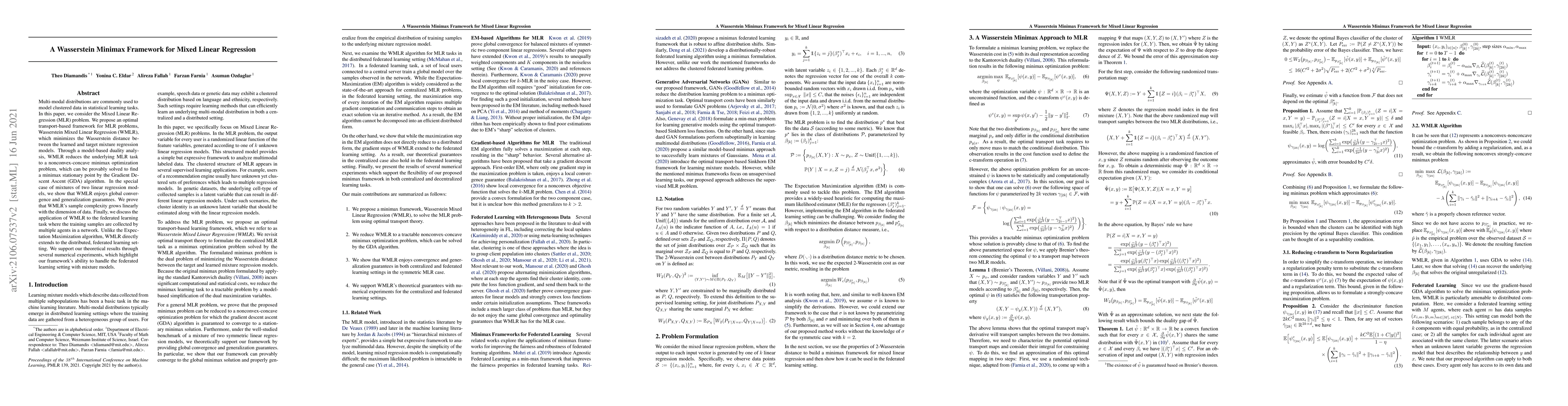 Multi-modal distributions are commonly used to model clustered data in statistical learning tasks. In this paper, we consider the Mixed Linear Regression (MLR) problem. We propose an optimal transport-based framework for MLR problems, Wasserstein Mixed Linear Regression (WMLR), which minimizes the Wasserstein distance between the learned and target mixture regression models. Through a model-based duality analysis, WMLR reduces the underlying MLR task to a nonconvex-concave minimax optimization problem, which can be provably solved to find a minimax stationary point by the Gradient Descent Ascent (GDA) algorithm. In the special case of mixtures of two linear regression models, we show that WMLR enjoys global convergence and generalization guarantees. We prove that WMLR's sample complexity grows linearly with the dimension of data. Finally, we discuss the application of WMLR to the federated learning task where the training samples are collected by multiple agents in a network. Unlike the Expectation Maximization algorithm, WMLR directly extends to the distributed, federated learning setting. We support our theoretical results through several numerical experiments, which highlight our framework's ability to handle the federated learning setting with mixture models.
