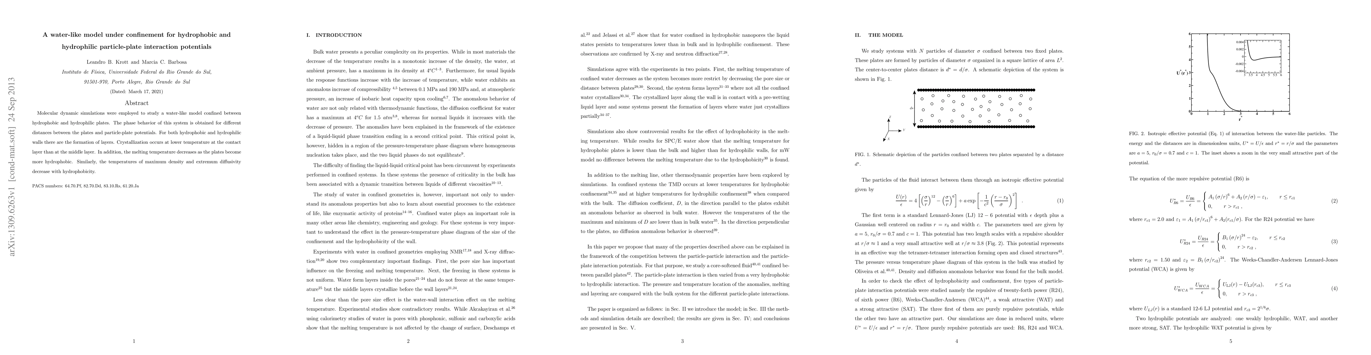 Molecular dynamic simulations reveal that a water-like model confined between hydrophobic and hydrophilic plates forms layers with crystallization occurring at lower temperatures at the contact layer. Hydrophobicity decreases melting and maximum density temperatures.