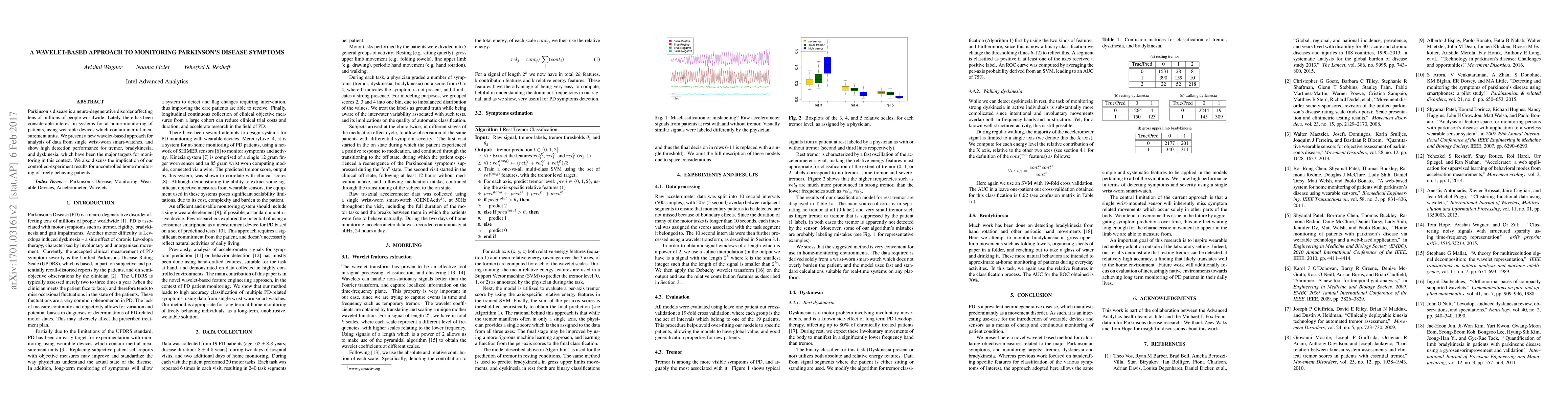 This paper introduces a wavelet-based method for analyzing data from wrist-worn smart-watches to monitor Parkinson's disease symptoms, achieving high detection rates for tremor, bradykinesia, and dyskinesia. The study discusses the potential for this approach in real-world, at-home patient monitoring.