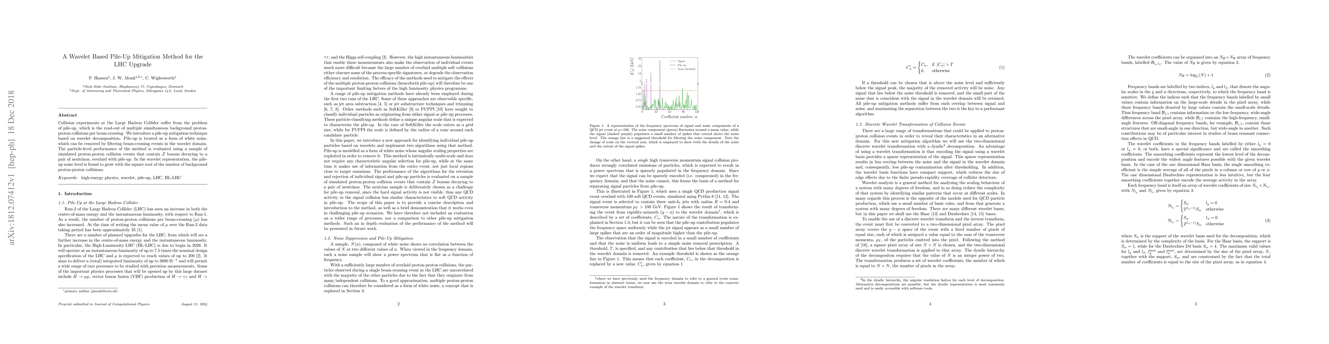 This paper proposes a wavelet-based method to mitigate pile-up in the Large Hadron Collider by filtering out background noise from simultaneous proton-proton collisions. The technique demonstrates effective noise reduction in simulated events, showing that pile-up noise increases with the square root of the number of background collisions.