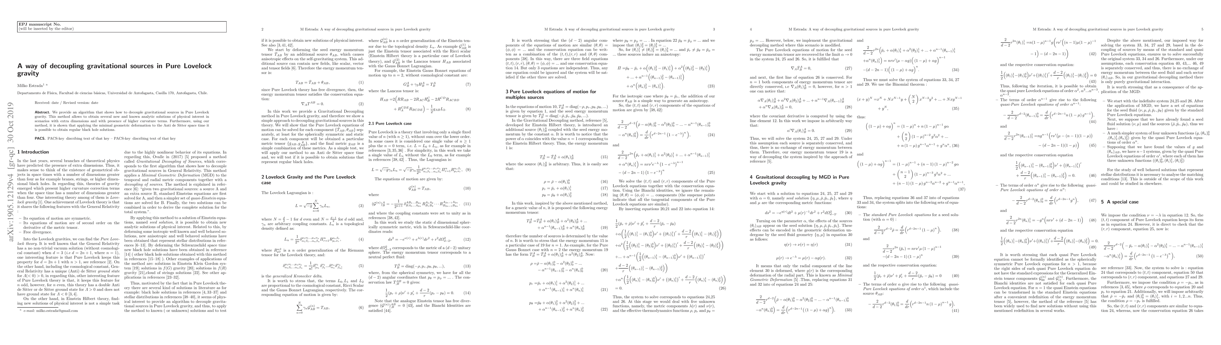 This paper presents an algorithm for decoupling gravitational sources in Pure Lovelock gravity, yielding new analytic solutions with extra dimensions and higher curvature terms. Additionally, it demonstrates how minimal geometric deformation of Anti de Sitter spacetime can produce regular black hole solutions.