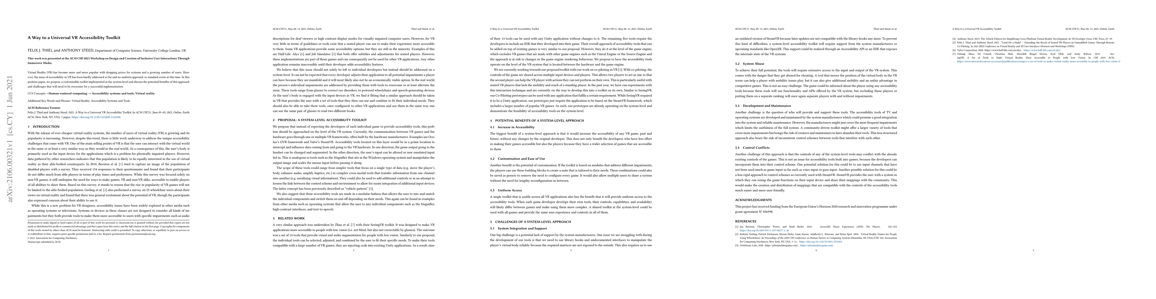 A universal VR accessibility toolkit is proposed to address the growing popularity of virtual reality while lacking a uniform approach to accessibility. A system-level implementation with customizable tools could improve user experience for people with disabilities.