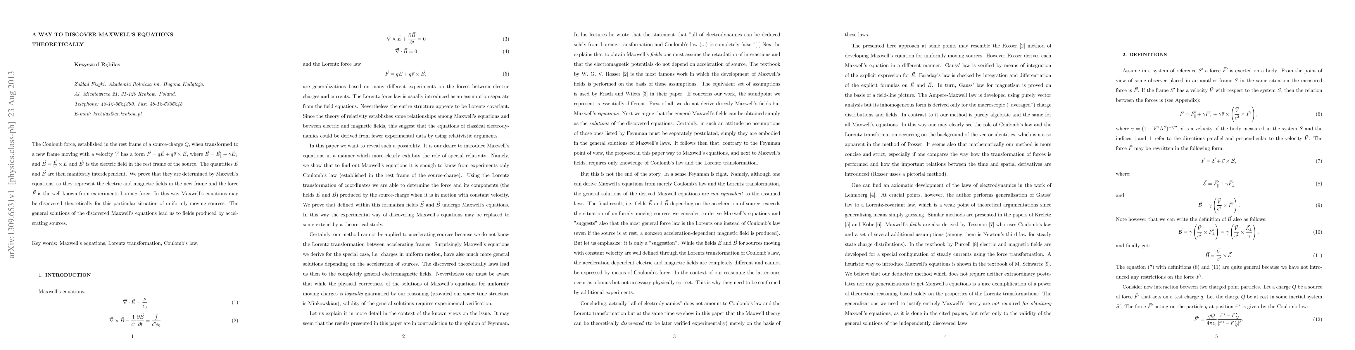 The Coulomb force, established in the rest frame of a source-charge $Q$, when transformed to a new frame moving with a velocity $\vec{V}$ has a form $\vec{F}= q\vec{{E}} + q\vec{v} \times \vec{{B}}$, where $\vec{{E}}=\vec{E}'_\parallel + \gamma\vec{E}'_\perp $ and $\vec{{B}}= \vec{\frac{V}{c^2}} \times \vec{{E}}$ and $\vec{E}'$ is the electric field in the rest frame of the source. The quantities $\vec{E}$ and $\vec{B}$ are then manifestly interdependent. We prove that they are determined by Maxwell's equations, so they represent the electric and magnetic fields in the new frame and the force $\vec{F}$ is the well known from experiments Lorentz force. In this way Maxwell's equations may be discovered theoretically for this particular situation of uniformly moving sources. The general solutions of the discovered Maxwell's equations lead us to fields produced by accelerating sources.