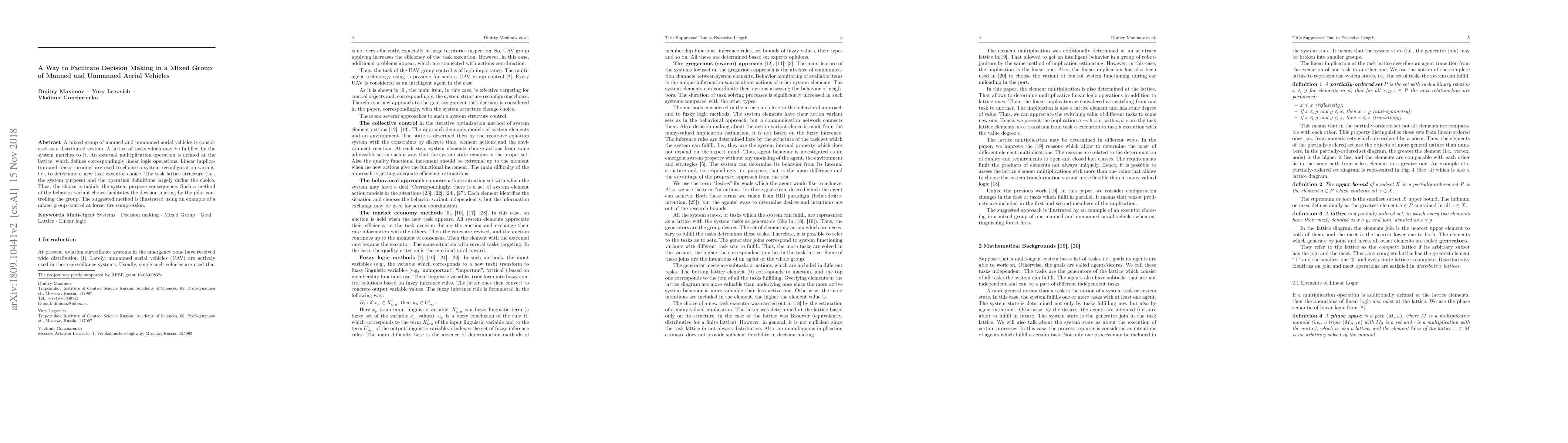 A mixed group of manned and unmanned aerial vehicles is considered as a distributed system. A lattice of tasks which may be fulfilled by the system matches to it. An external multiplication operation is defined at the lattice, which defines correspondingly linear logic operations. Linear implication and tensor product are used to choose a system reconfiguration variant, i.e., to determine a new task executor choice. The task lattice structure (i.e., the system purpose) and the operation definitions largely define the choice. Thus, the choice is mainly the system purpose consequence. Such a method of the behavior variant choice facilitates the decision making by the pilot controlling the group. The suggested approach is illustrated using an example of a mixed group control at forest fire compression.