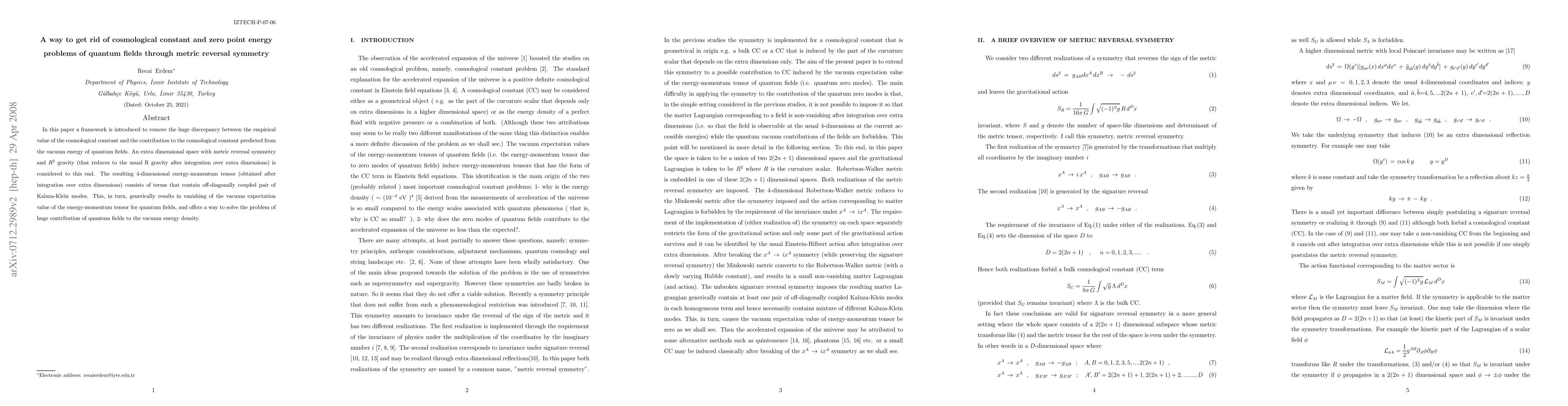 In this paper a framework is introduced to remove the huge discrepancy between the empirical value of the cosmological constant and the contribution to the cosmological constant predicted from the vacuum energy of quantum fields. An extra dimensional space with metric reversal symmetry and $R^2$ gravity is considered to this end. The resulting 4-dimensional energy-momentum tensor (obtained after integration over extra dimensions) consists of terms that contain off-diagonally coupled pair of Kaluza-Klein modes. This, in turn, generically results in vanishing of the vacuum expectation value of the energy-momentum tensor for quantum fields, and offers a way to solve the problem of huge contribution of quantum fields to the vacuum energy density.