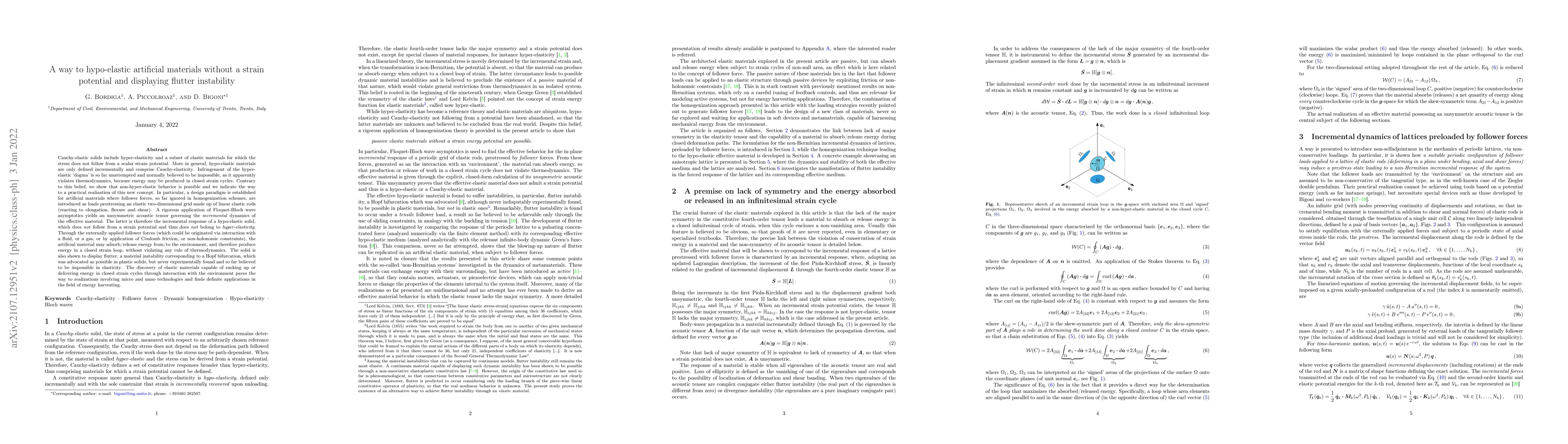 This paper proposes a novel method for creating hypo-elastic artificial materials that do not rely on a strain potential, thus breaking the hyper-elastic 'dogma'. The design involves prestressing an elastic grid with follower forces, enabling the material to absorb and release energy in closed strain cycles without violating thermodynamic laws, and displaying a flutter instability.