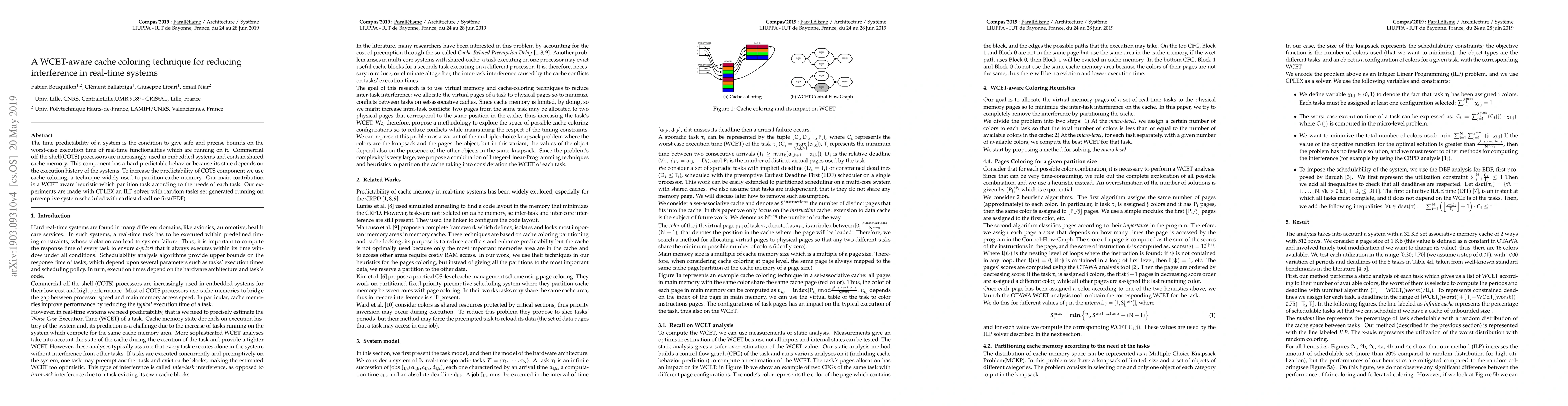 This paper proposes a WCET-aware cache coloring technique to enhance predictability in real-time systems using COTS processors. The authors introduce a heuristic to partition cache memory based on task requirements, aiming to reduce interference and improve worst-case execution time bounds. Experiments were conducted using CPLEX and random task sets on a preemptive EDF scheduler.
