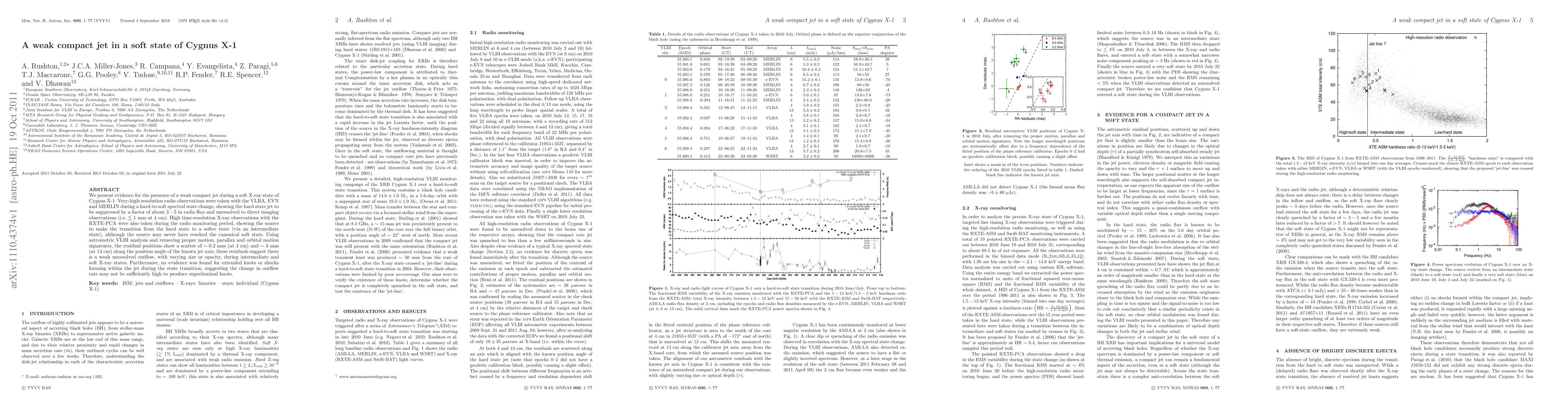 This paper presents evidence of a weak, compact jet in the soft X-ray state of Cygnus X-1, detected through high-resolution radio observations and X-ray monitoring. The jet is significantly weaker and unresolved compared to its hard state counterpart, with no indication of extended knots or shocks during the state transition.
